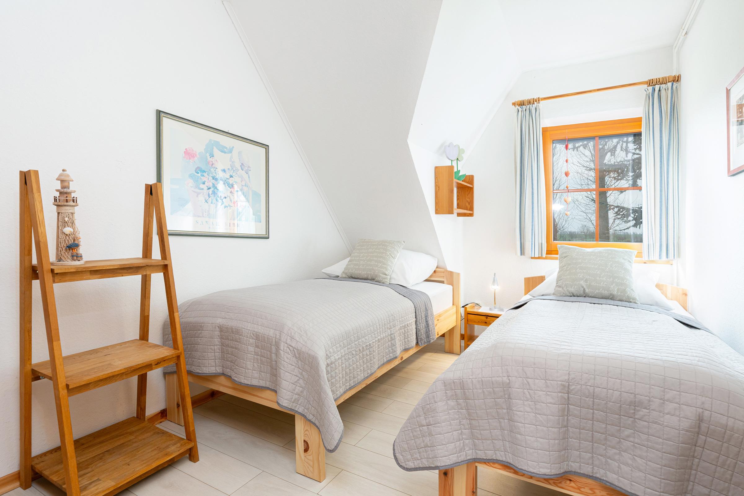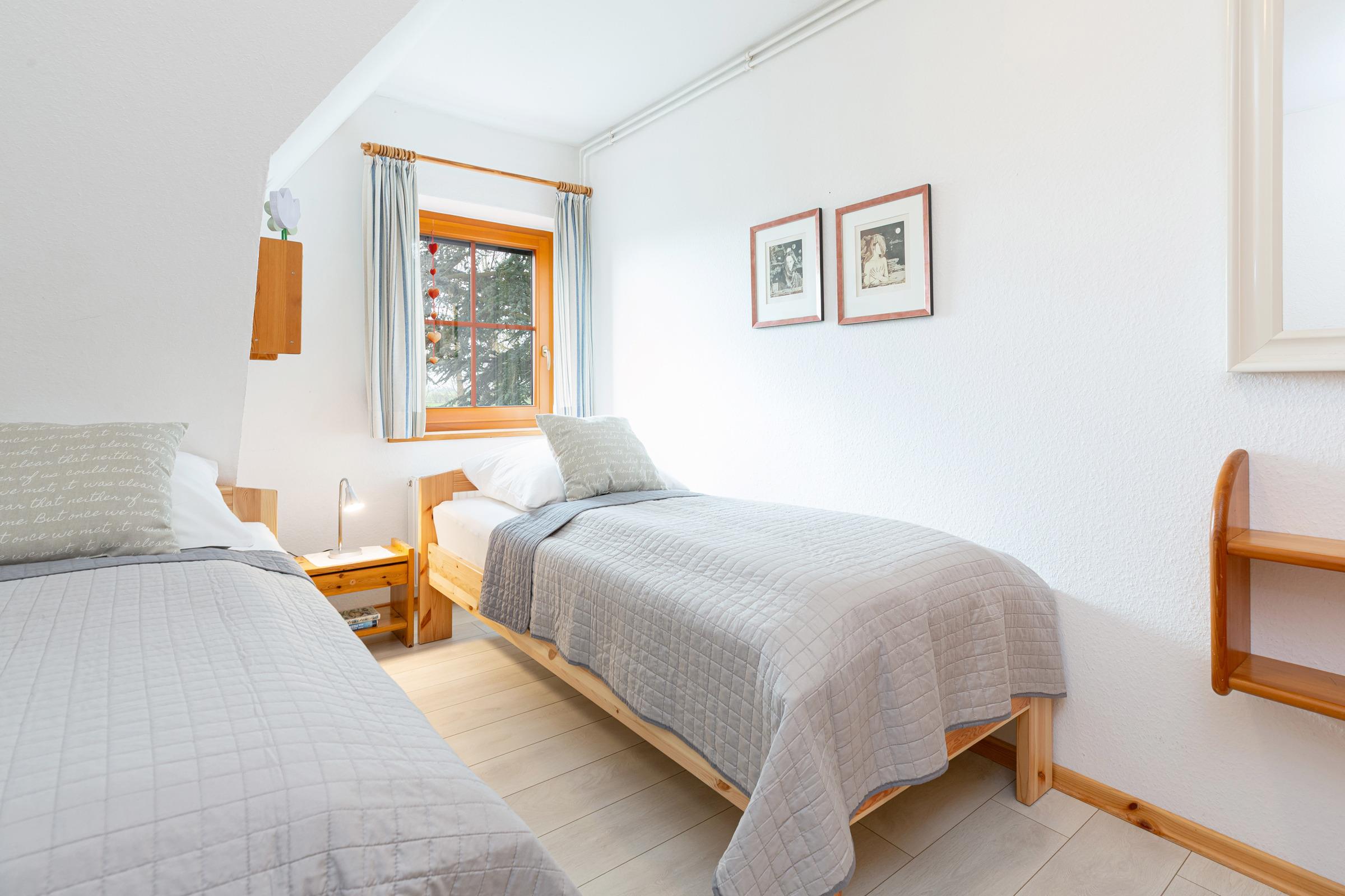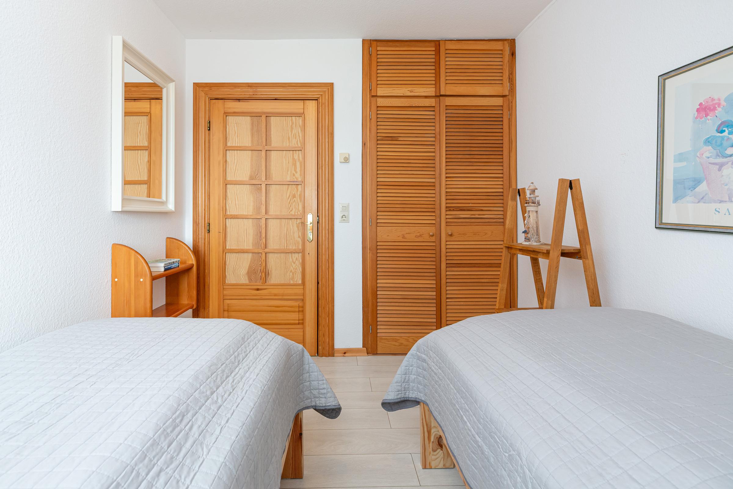 Schlafzimmer 2: 2 Einzelbetten (je 90x200 cm), Verdunkelung: Gardinen, Kleiderschrank, kein Platz für ein Babybett vorhanden