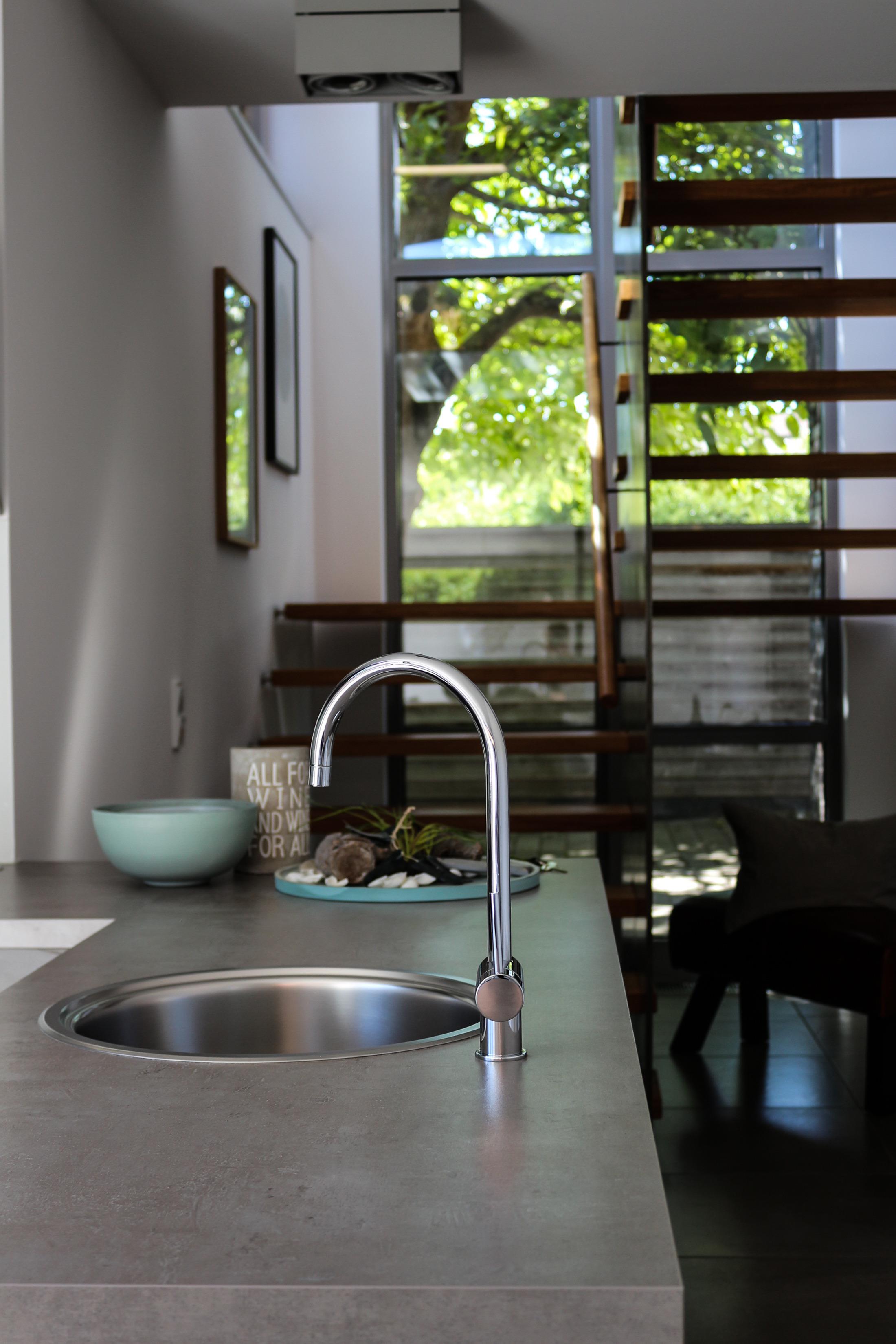 Der mittlere Kubus ist das Zentrum der Wohnung mit Küche und Essplatz im Erdgeschoß und Wohnzimmer im Obergeschoss.