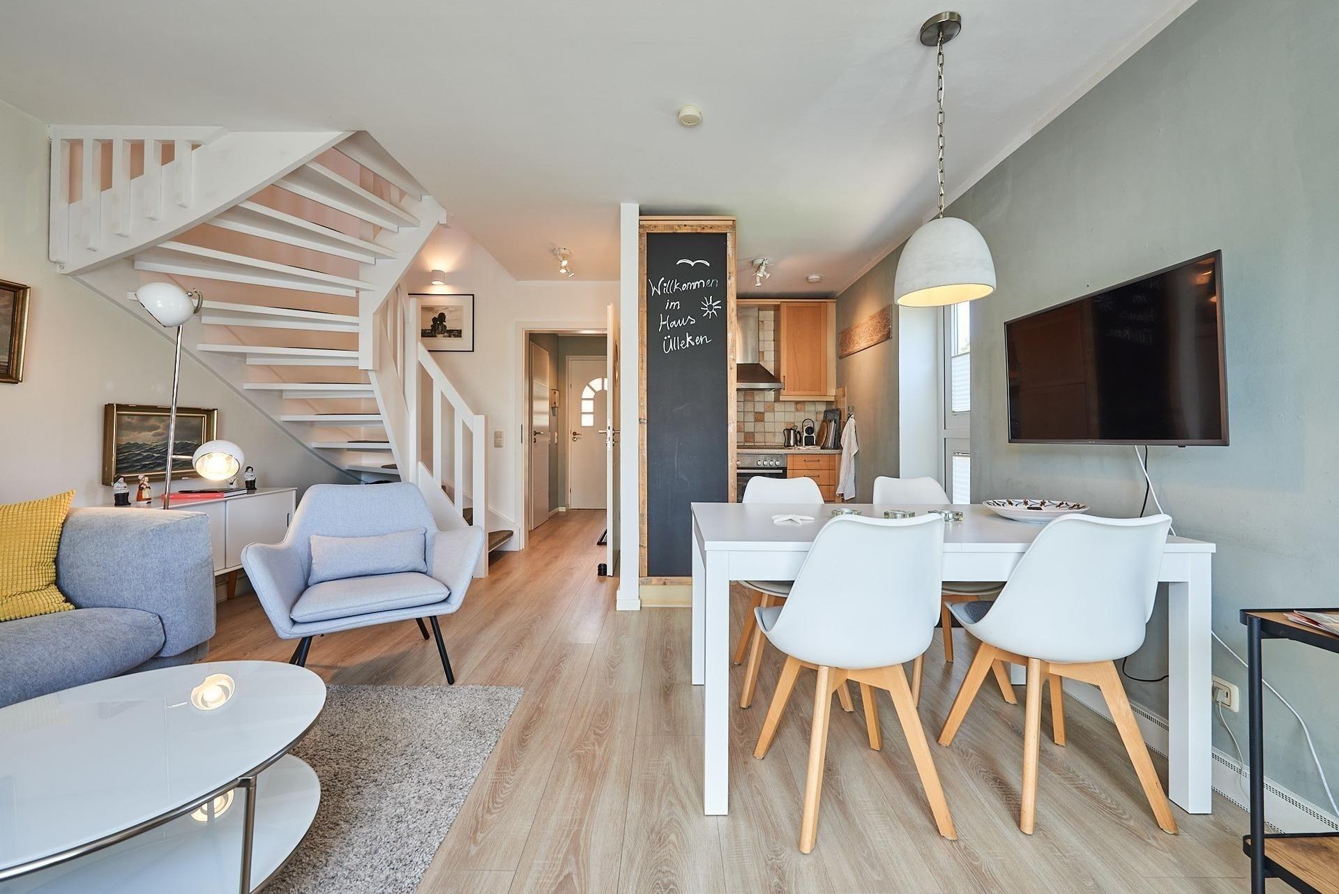Genießen Sie die ruhige Lage, die trotz der Nähe zum Zentrum von Burg und dem Hafen von Burgstaaken absolute Erholung verspricht. Das traumhafte Ferienhaus Ülleken ist der perfekte Rückzugsort für einen komfortablen und unvergesslichen Aufenthalt. Entspannen Sie im Wohnbereich vor dem Kaminofen oder spielen Sie einige der Spiele, die für Sie bereitstehen. Die sehr gut ausgestattete Küche lädt zum Kochen ein. Es gibt drei gemütliche Schlafzimmer mit hochwertigen Möbeln und Fernseher, darunter ein Hauptschlafzimmer mit einem Doppelbett (2x 90x200cm) und ein zusätzliches Schlafzimmer mit Doppelbett im Dachgeschoss. Bitte beachten Sie, dass diese Zimmer nur durch eine Treppe getrennt sind. Dazu gibt es noch ein Schlafzimmer mit zwei Einzelbetten (je 90x200cm). Zwei Duschbäder sorgen für einen entspannten Start in den Tag. Der eingezäunte Garten bietet zahlreiche Sitz- und Liegemöglichkeiten sowie einen Gartenschuppen. Die Lage des Hauses ist ideal für Erkundungstouren zu Fuß oder mit dem Rad: Der Burger Binnensee und der feinsandige Südstrand mit Strandkorbvermietung sind nur einen Katzensprung entfernt.