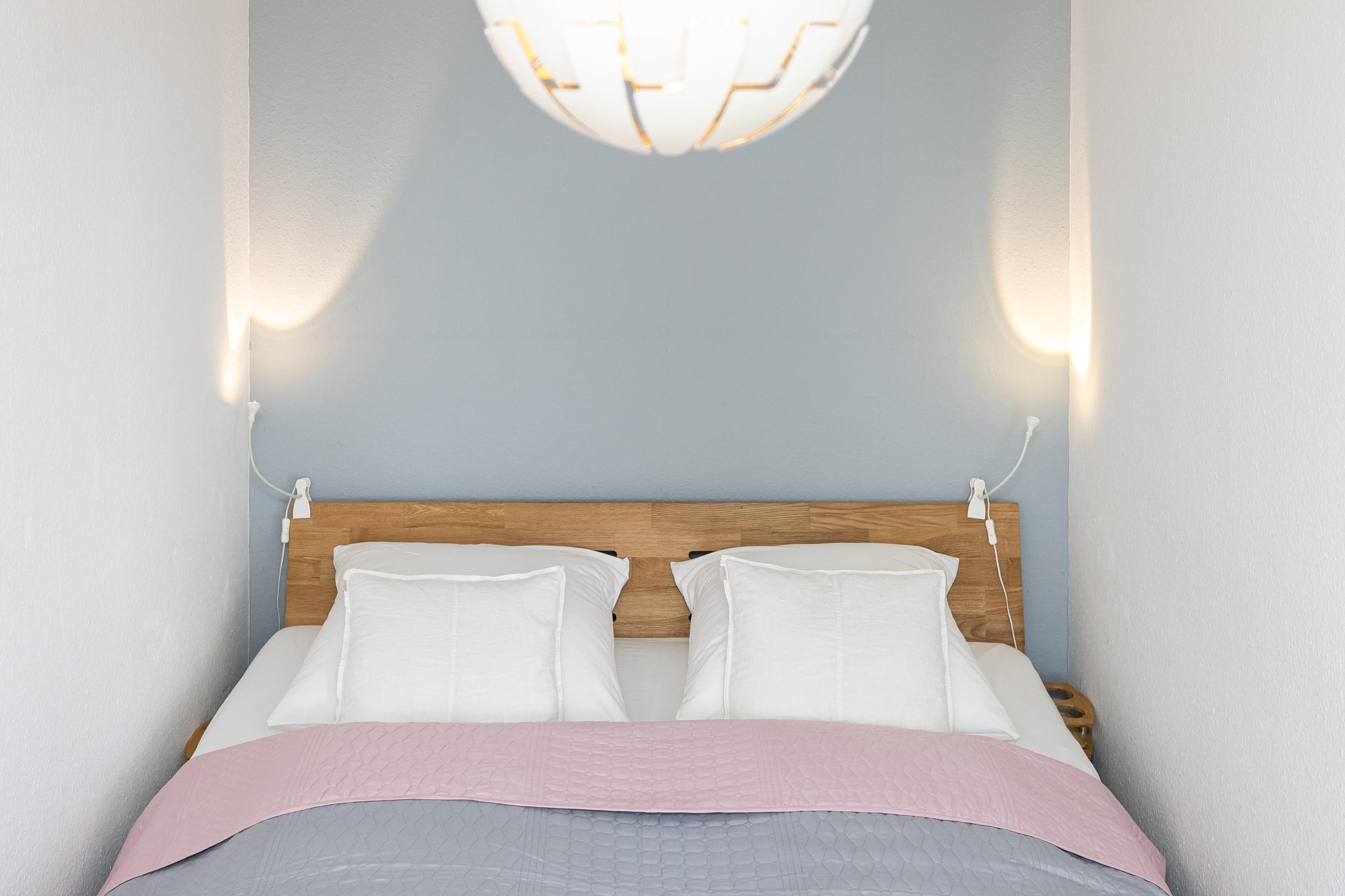 Schlafzimmer: 1 Doppelbett (180x200 cm), Verdunkelung: Plissee, Kleiderschrank, kein Patz für ein Babybett vorhanden