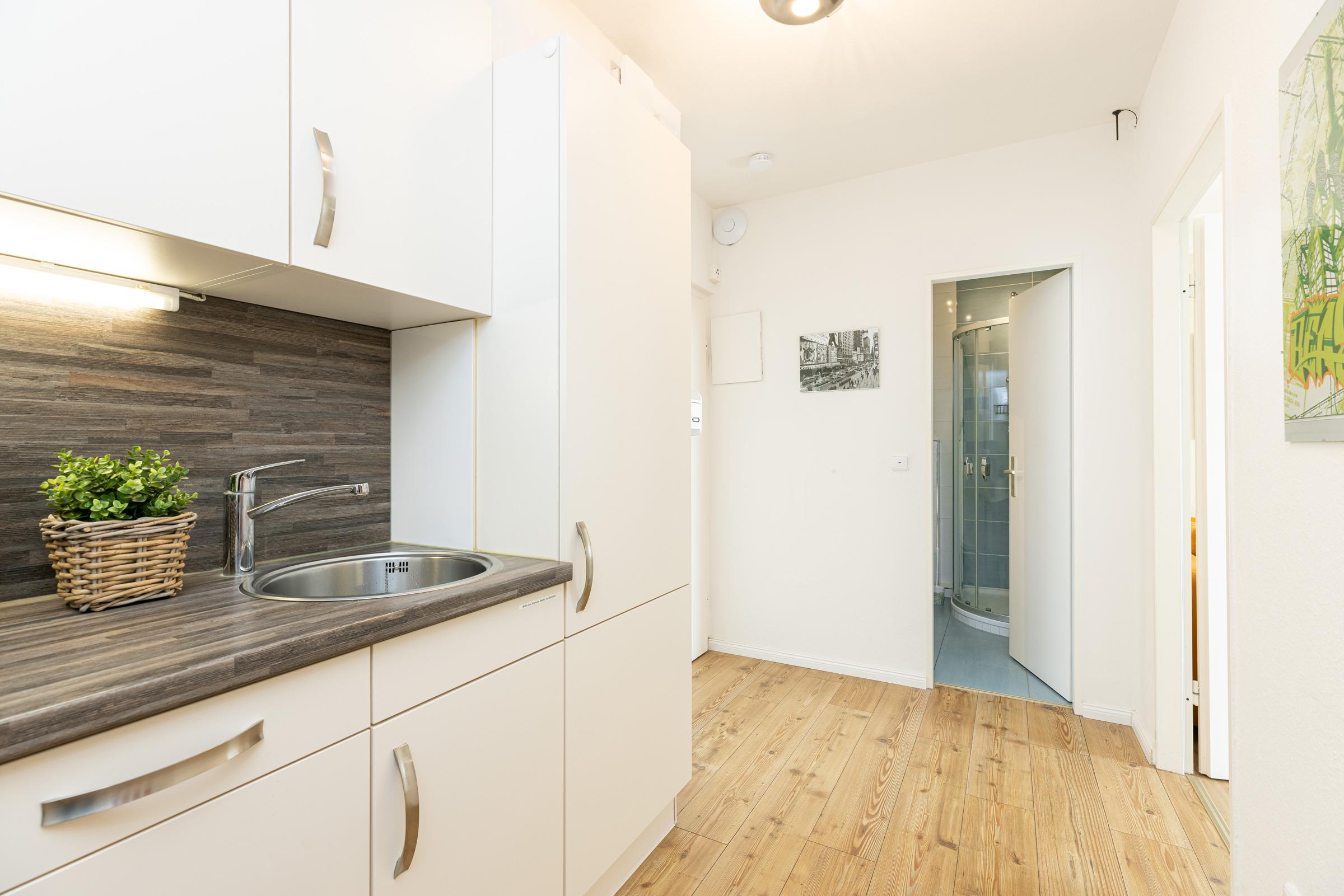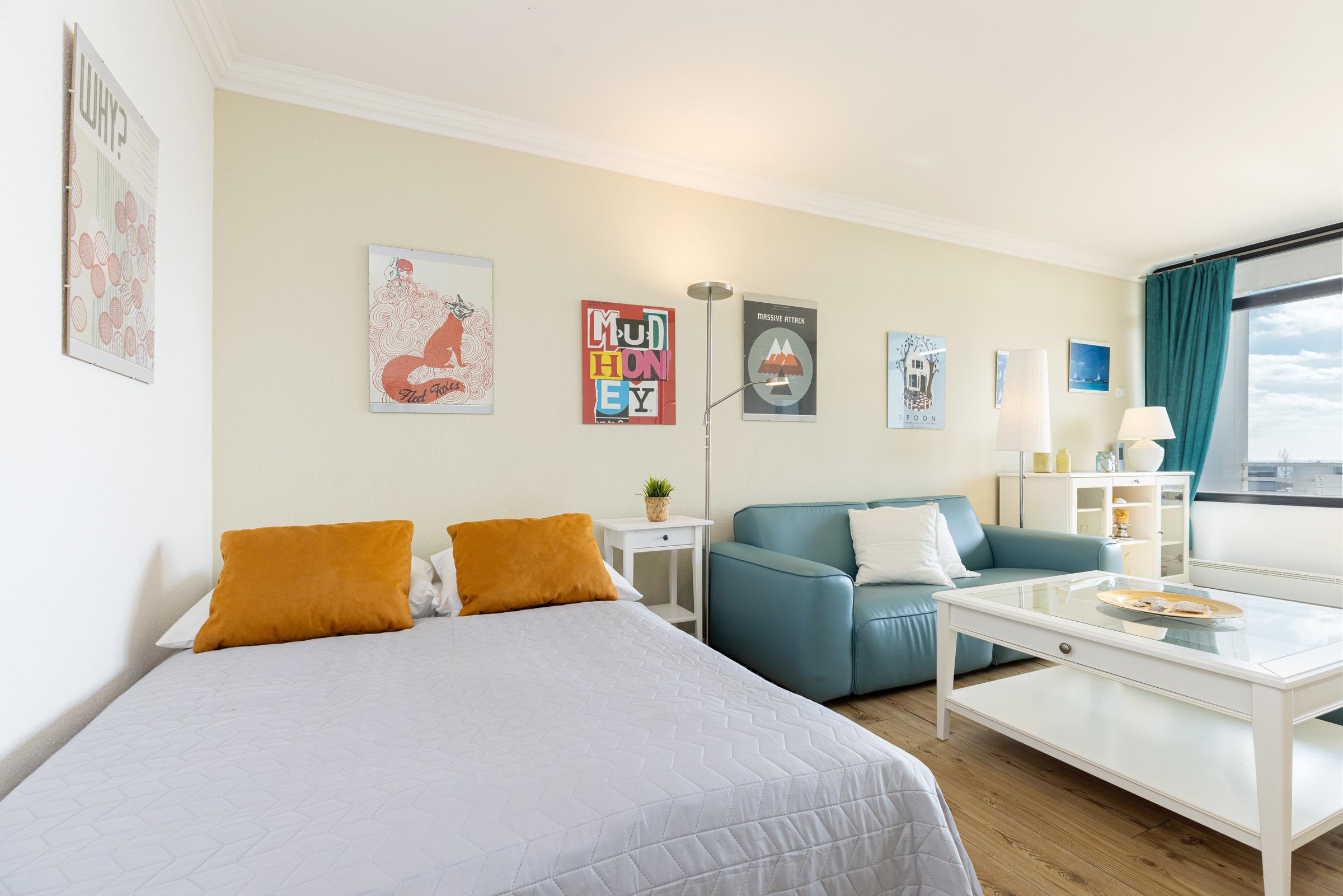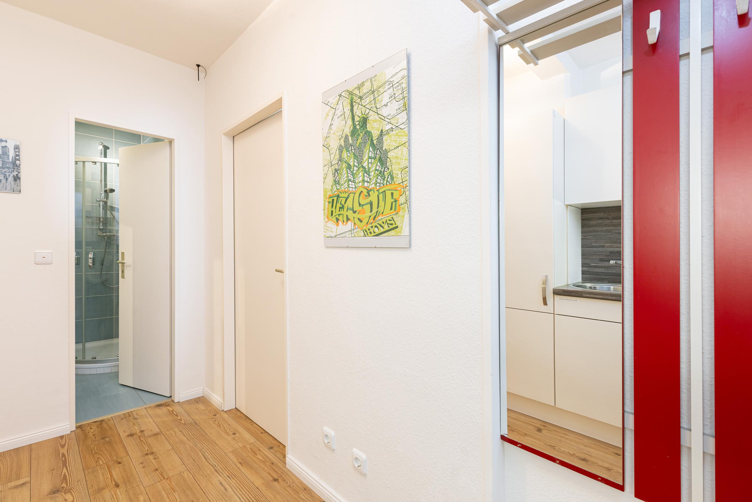 Im kombinierten Wohn-/Schlafraum befindet sich ein Schlafsofa für 2 Personen (140x200 cm), eine Sofaecke mit TV und eine Essecke mit Blick aufs Meer. Am Terrassenfenster als Schiebetür lädt ein 6 m² großer, nach Südwesten ausgerichteter Balkon zum Sonnenbaden oder zum Essen mit Meerblick ein. Ein Flachbildfernseher und ein CD/iPod/mp3-Player mit Radio sind vorhanden. In der Küche befindet sich die übliche Standardausstattung wie Kaffeemaschine, Mikrowelle, Toaster, etc. Im Schlafraum finden Sie ein bequemes Doppelbett (180x200 cm), Kleiderschrank sowie Kommode. Das moderne Bad ist mit einer Dusche, einem Handtuchheizkörper und einem deckenhohen, beleuchteten Wandspiegel ausgestattet. Das Wohn- und Schlafzimmer haben einen Laminatfußboden.