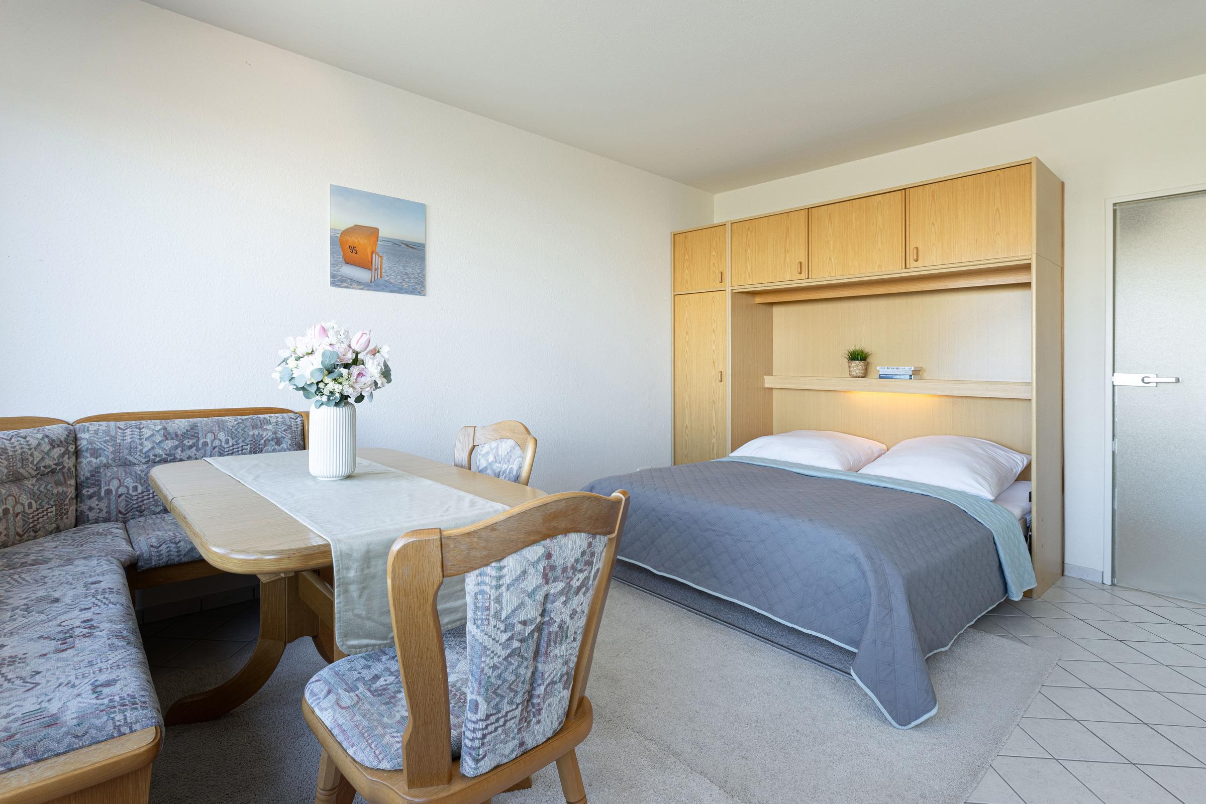 Ankommen, auspacken, wohlfühlen! Diese schöne Ferienwohnung überzeugt durch ihre gemütliche Einrichtung und ihre exklusive Lage - nur rund 100 Meter vom Strand entfernt. Es erwarten Sie ein Wohnzimmer mit schöner Sitzecke, TV-Gerät und einem bequemen Doppel-Schrankbett, in einem separaten Schlafraum steht ein Einzel-Schrankbett. In der gut ausgestatteten Küche können Sie sich prima selbst versorgen. Das kleine, aber feine Duschbad bringt Sie entspannt in den neuen Tag..