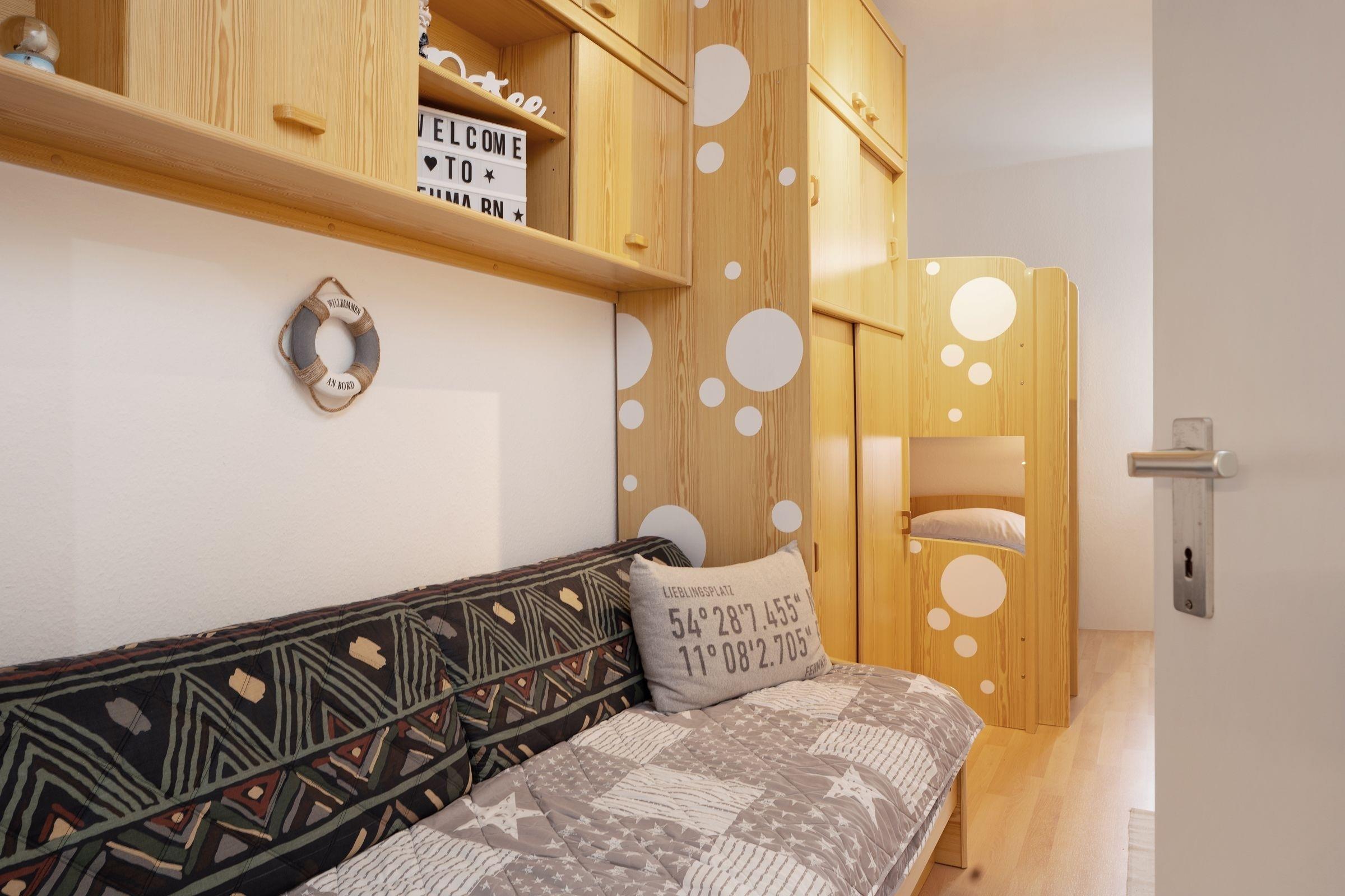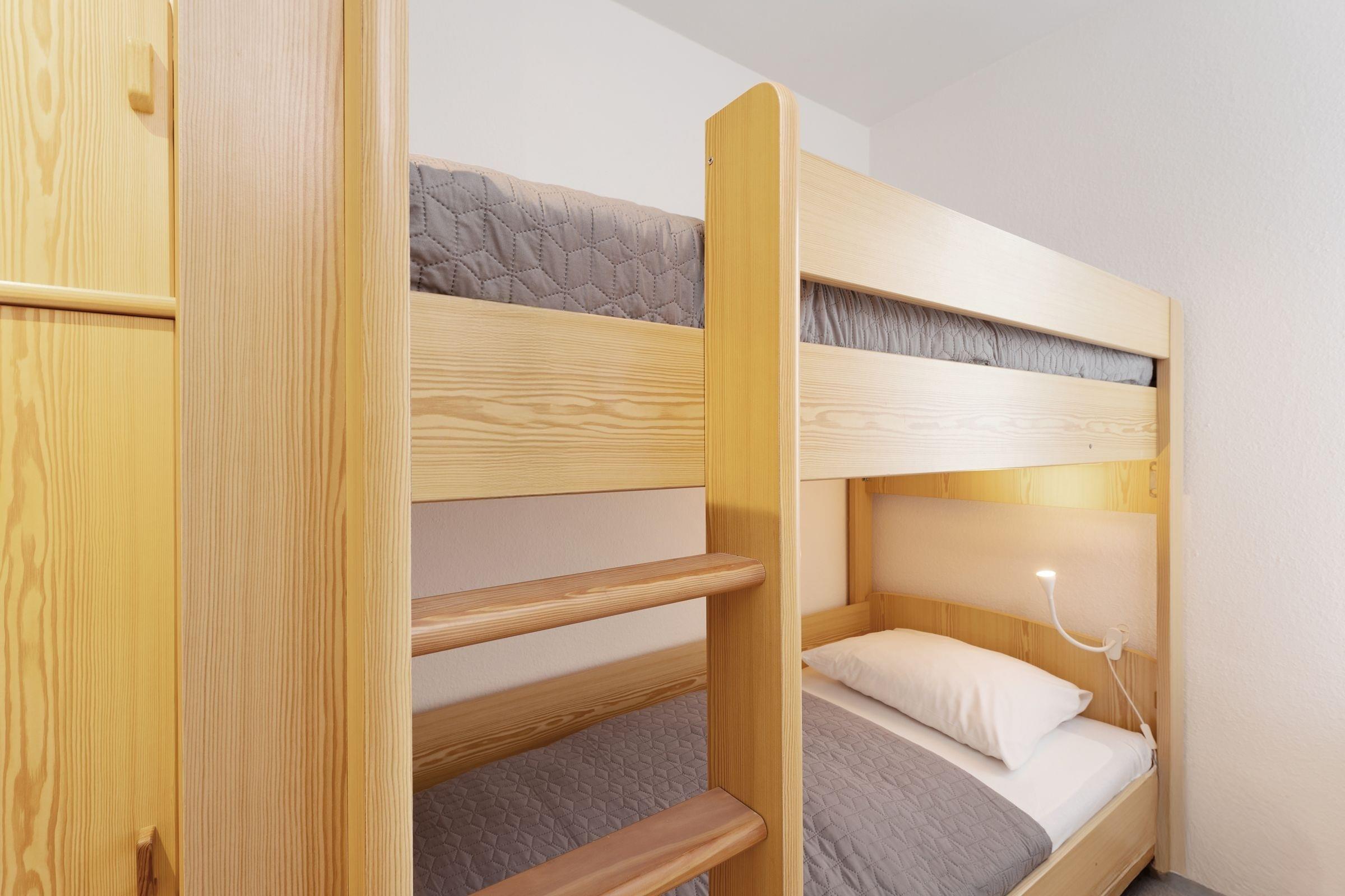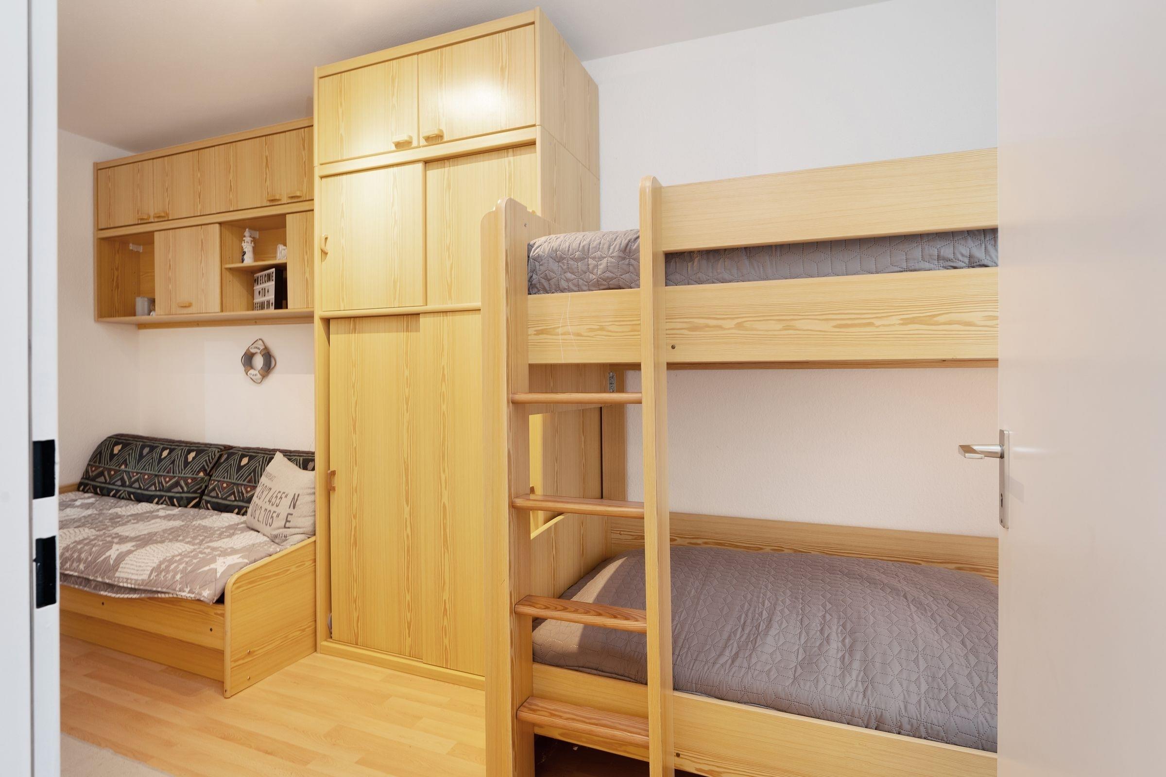 Schlafzimmer: 1 Einzelbett (90x190 cm), 1 Etagenbett (2x 90x190 cm), Kleiderschrank, Verdunkelung: Vorhang, Platz für ein Babybett vorhanden