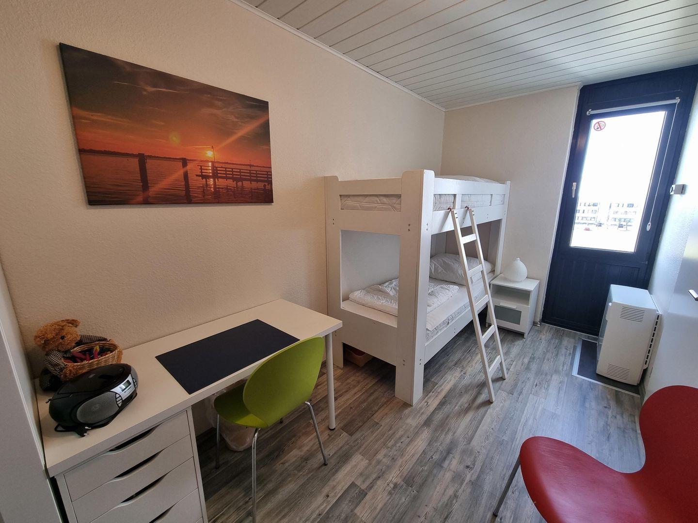 Vom Balkon aus hat man einen wunderbaren Meerblick. Die Ferienwohnung verfügt über einen kombinierten Wohn-/Schlafraum mit Essecke, Flachbild-TV und CD-Radio, einen separaten Schlafraum mit einem Etagenbett und einem zusätzlichen Kinderreisebett sowie ein Kinderhochstuhl, einem Bad mit Dusche und WC und einer komplett ausgestatteten Küche mit Geschirrspüler, Mikrowelle, Kühl- und Gefrierschrank und Herd mit Backofen.