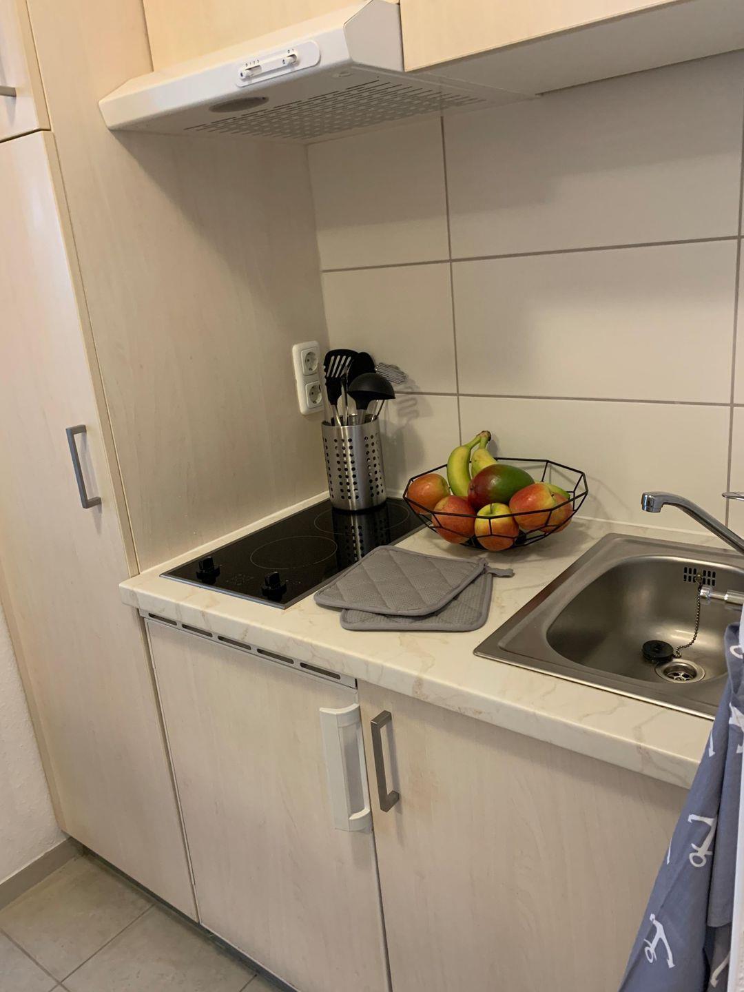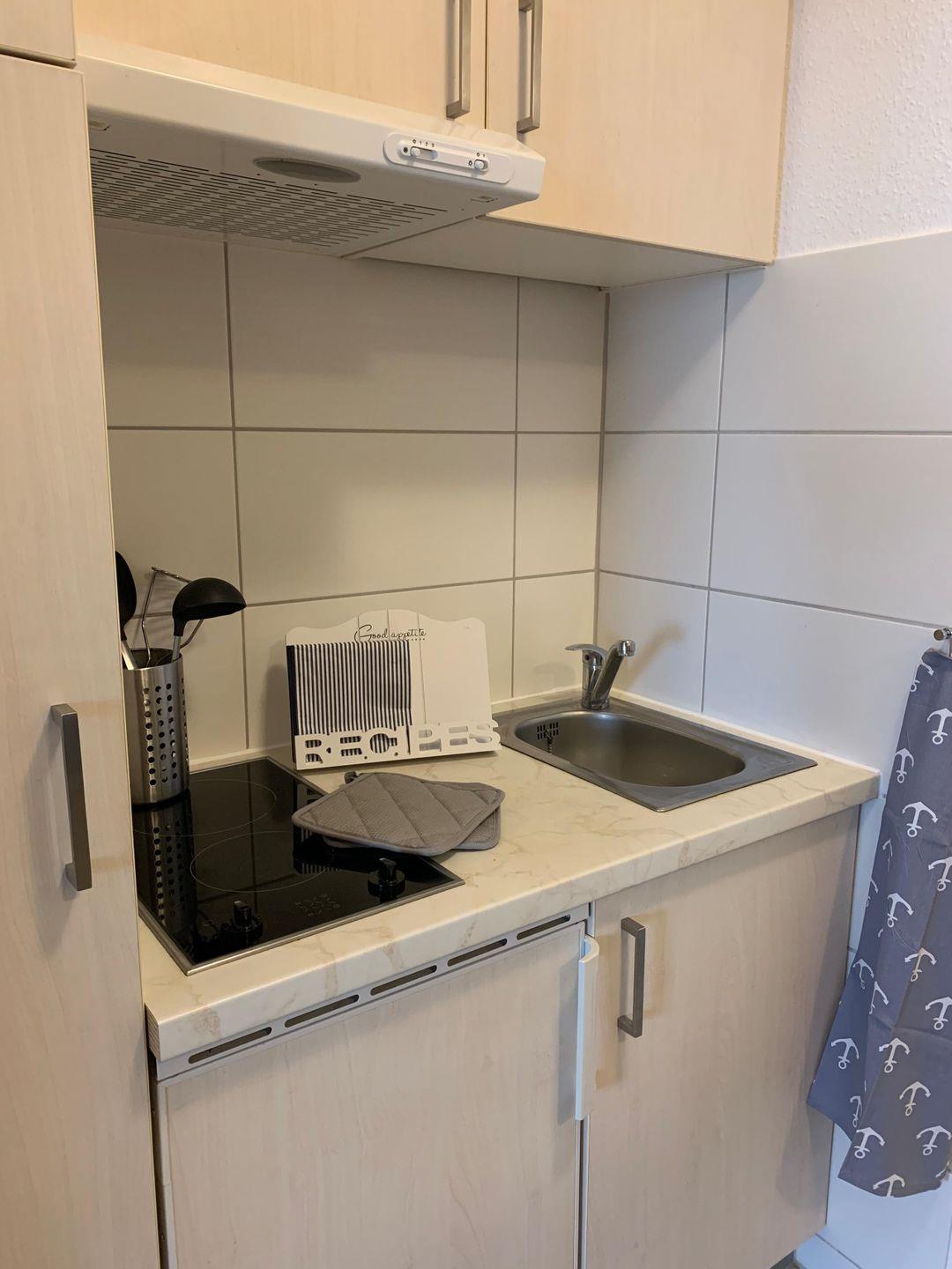 Die Küche ist voll ausgestattet mit einem 2 Platten Ceran- Herd, Mikrowelle, Kaffeemaschine, Kühlschrank uvm.