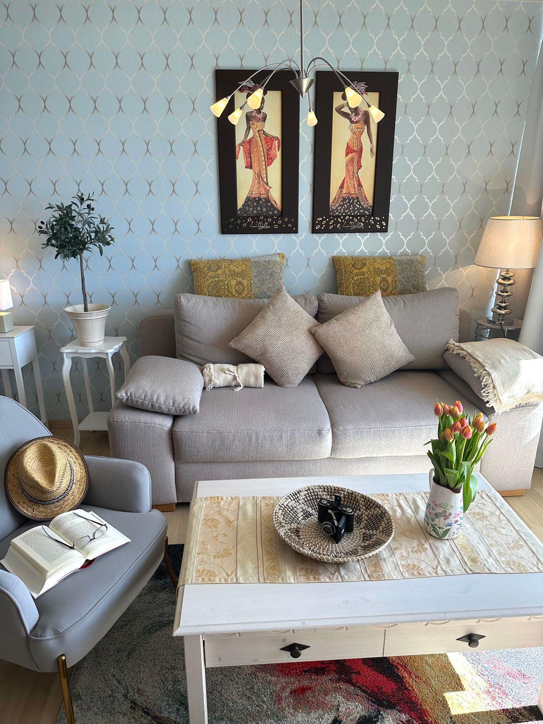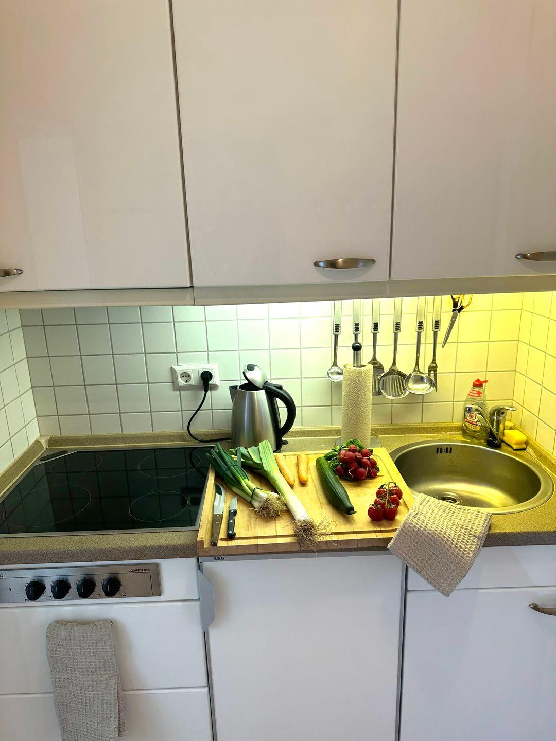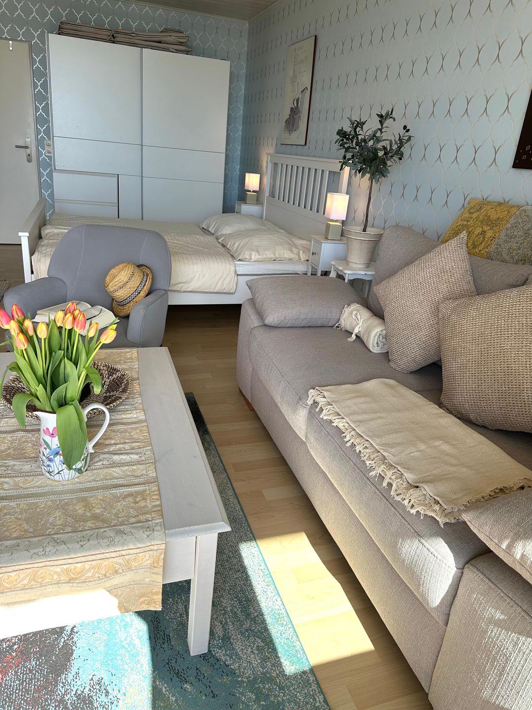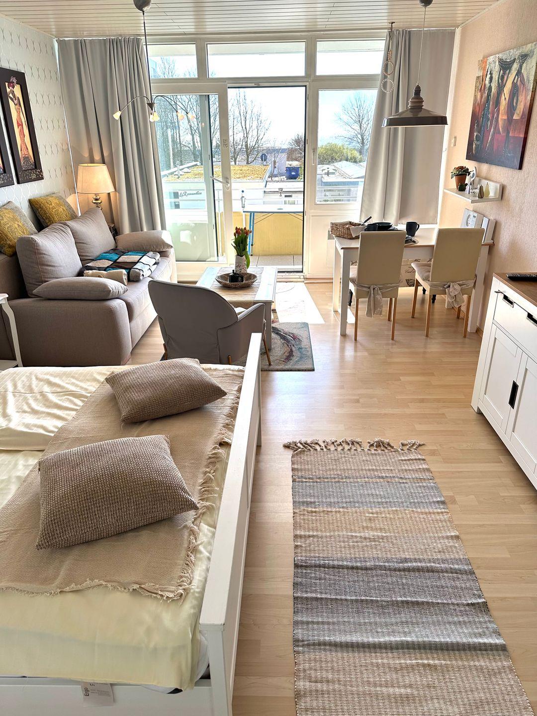Das Appartement ist für 2 Personen ausgestattet. Der Wohnbereich ist mit einem integrierten Essbereich, einem komfortablen Bett (180*200 cm), einem gemütlichen Sofa, sowie einer Fernsehecke und einer großen Fensterfront mit Zugang zum Südbalkon ausgestattet. Die Wohnung ist sehr gepflegt und hochwertig ausgestattet. Sie ist sehr liebevoll eingerichtet, hier stimmt alles.