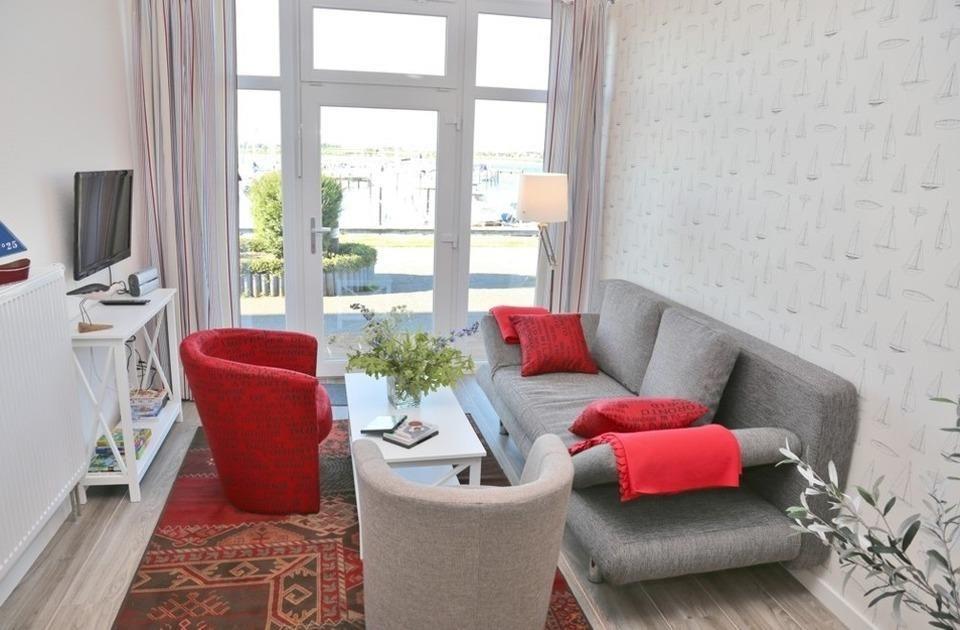 Diese Wohnung ist die größte Wohnung im Erdgeschoss und besteht aus einem Wohnzimmer, einem großen Duschbad, einem separatem Schlafzimmer, einer abgetrennten Versorgungsbar und einem abgetrennten zweiten Schlafbereich. Das Wohn-/Schlafzimmer verfügt über einen TV, BluRay-Player, Radio, einem Sofa welches ausziehbar auf eine 140x200cm Liegefläche ist.Im Objekt befindet sich ein festes w-lan Netzwerk, in der Wohnung ein smart TV. Ein Essbereich mit Tisch und Stühlen ist ebenfalls im Wohnbereich vorhanden. Das separate Schlafzimmer hat den Ausblick zum Yachthafen und verfügt über einen großen Kleiderschrank, einen Sessel und einem Doppelbett (180x200cm). Der separate Schlafbereich verfügt über eine große Kommode und einem Wandklappbett (180x200cm). Das Badezimmer ist sehr geräumig und mit einer barrierefreien ebenerdigen Dusche ausgestattet. Die Versorgungsbar verfügt über einen Kühlschrank, einen Cerankochfeld, einem Waschbecken, Toaster, Kaffeemaschine, Mini-Mobilbackofen und einer Mikrowelle. Die Wohnung ist sowohl über den Hausflur als auch über die Terrassen zugänglich. Ein Strandkorb wartet auf der Terrasse auf Sie.