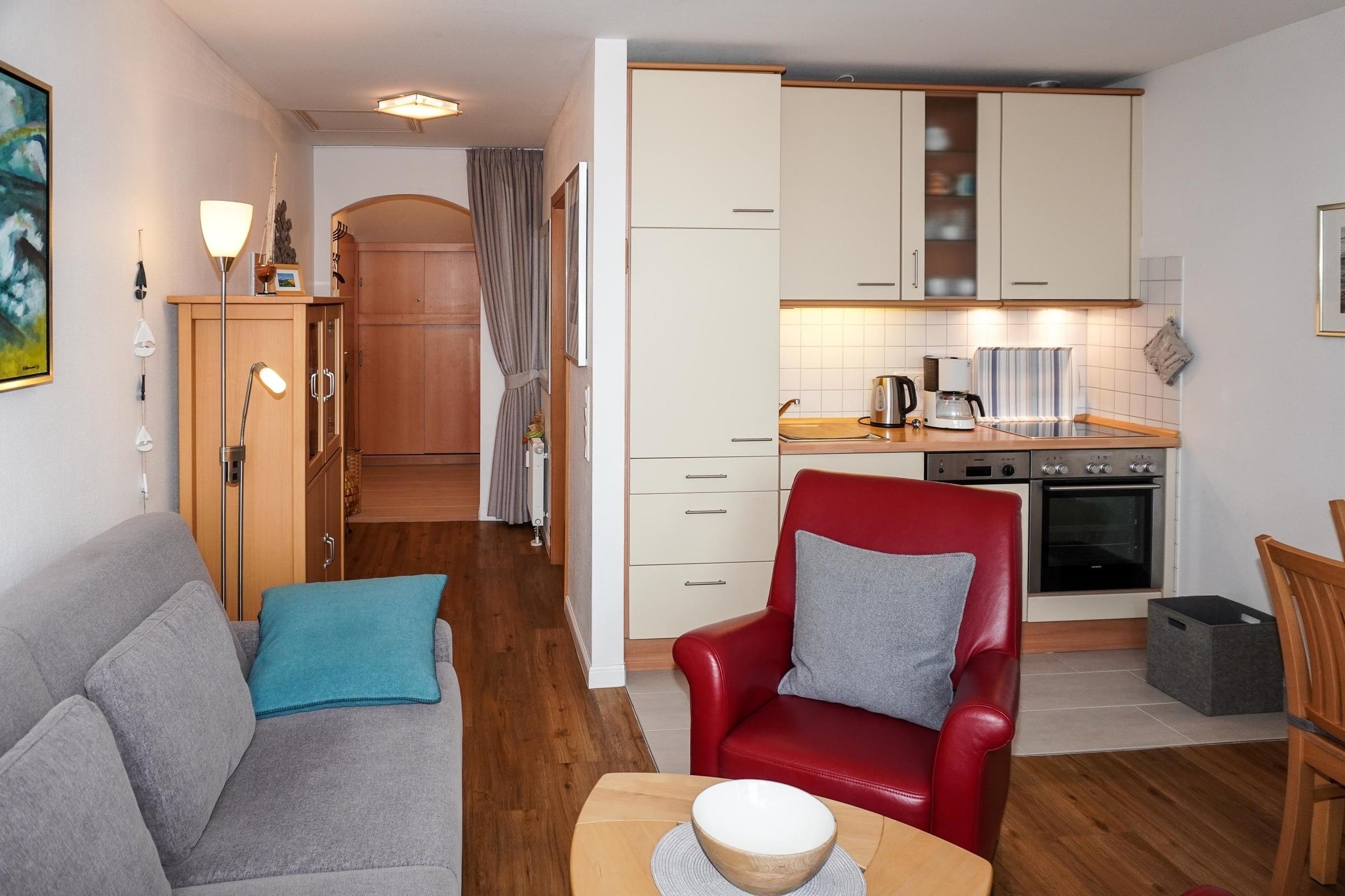 Unsere liebevoll und gemütlich eingerichtete Ferienwohnung in der "Strandburg" liegt direkt am feinsandigen Südstrand und bietet Platz für 2 Personen. Die Wohnung liegt im 3. Stock, den Sie mühelos mit dem Fahrstuhl erreichen. Das Schlafzimmer hat zwei Einzelbetten und ein Fenster zur Wasserseite. Vom Balkon genießen Sie herrlichen Blick über den Yachthafen und den Binnensee. Abends können Sie bei einem Glas Wein den Sonnenuntergang erleben.