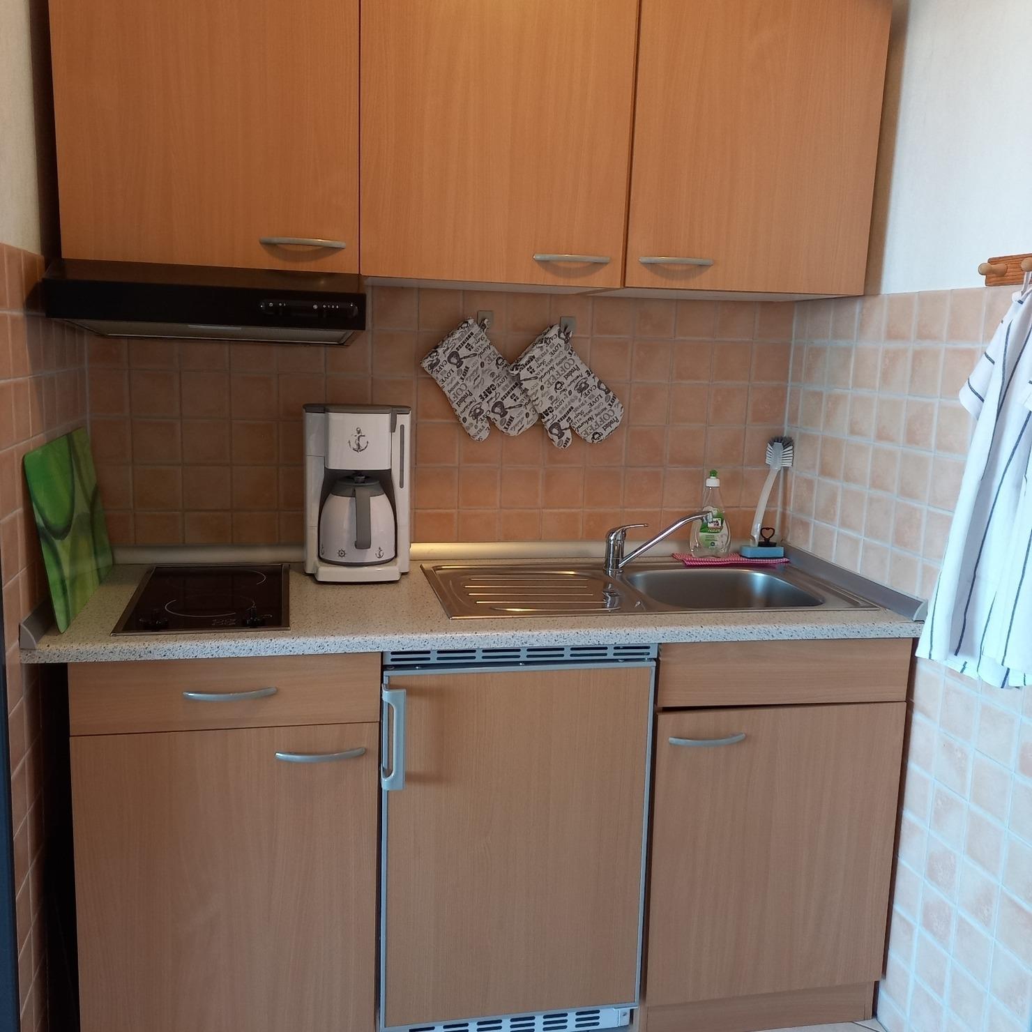 Die Küche ist komplett ausgestattet mit Ceran-Kochfläche, Mikrowelle, Minibackofen, Spülbecken, Kühlschrank mit Gefrierfach, Kaffeemaschine, Toaster und Wasserkocher. Selbstverständlich verfügt sie über genügend Gläser, Geschirr, Bestecke, Töpfe, Pfanne, Geschirrspülmittel, Schwamm, Läppchen und frischen Geschirrtüchern.