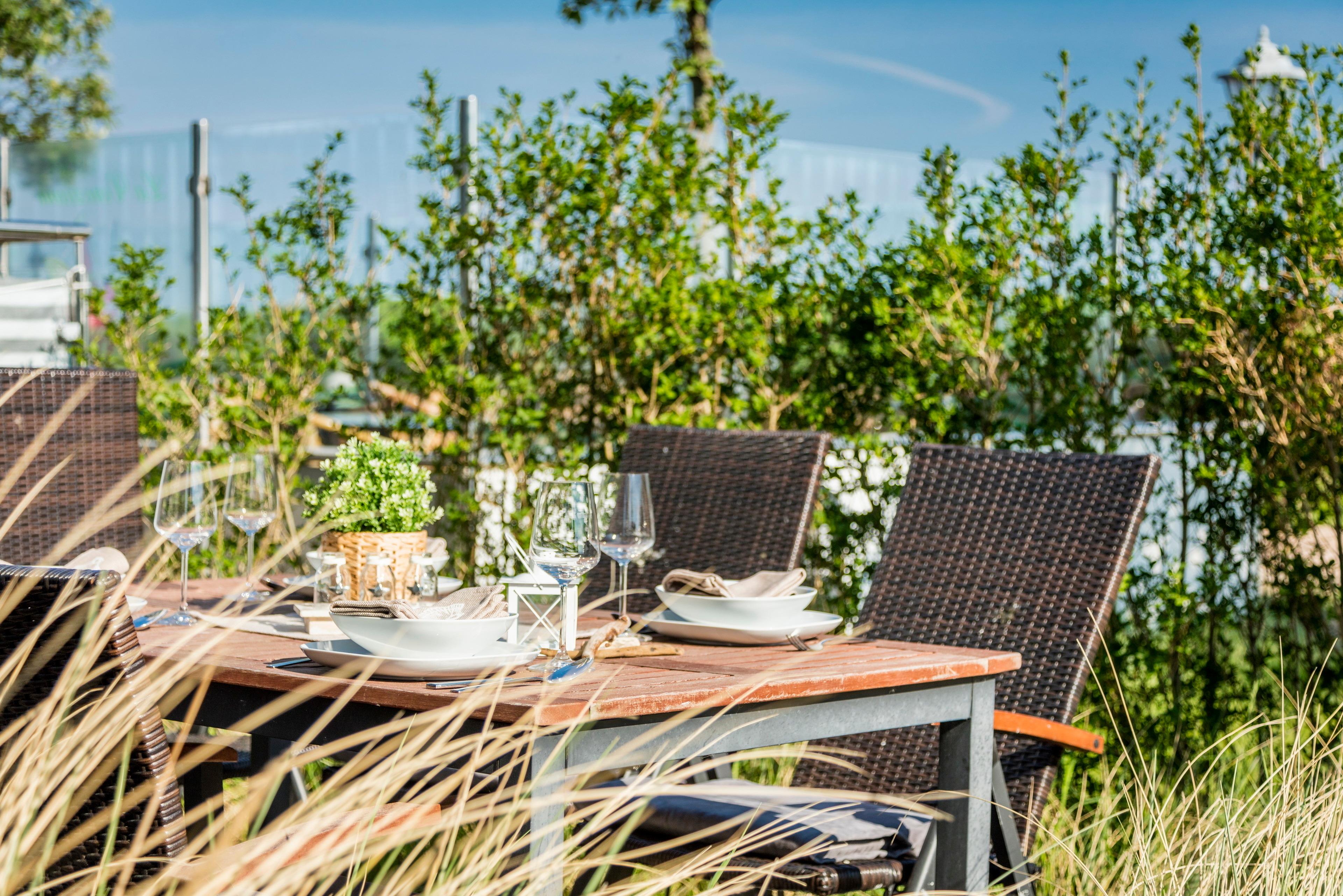 Von der Südwest-Terrasse, welche von einer Hecke umgeben ist, können Sie das bunte Treiben auf der Promenade und am Strand beobachten.