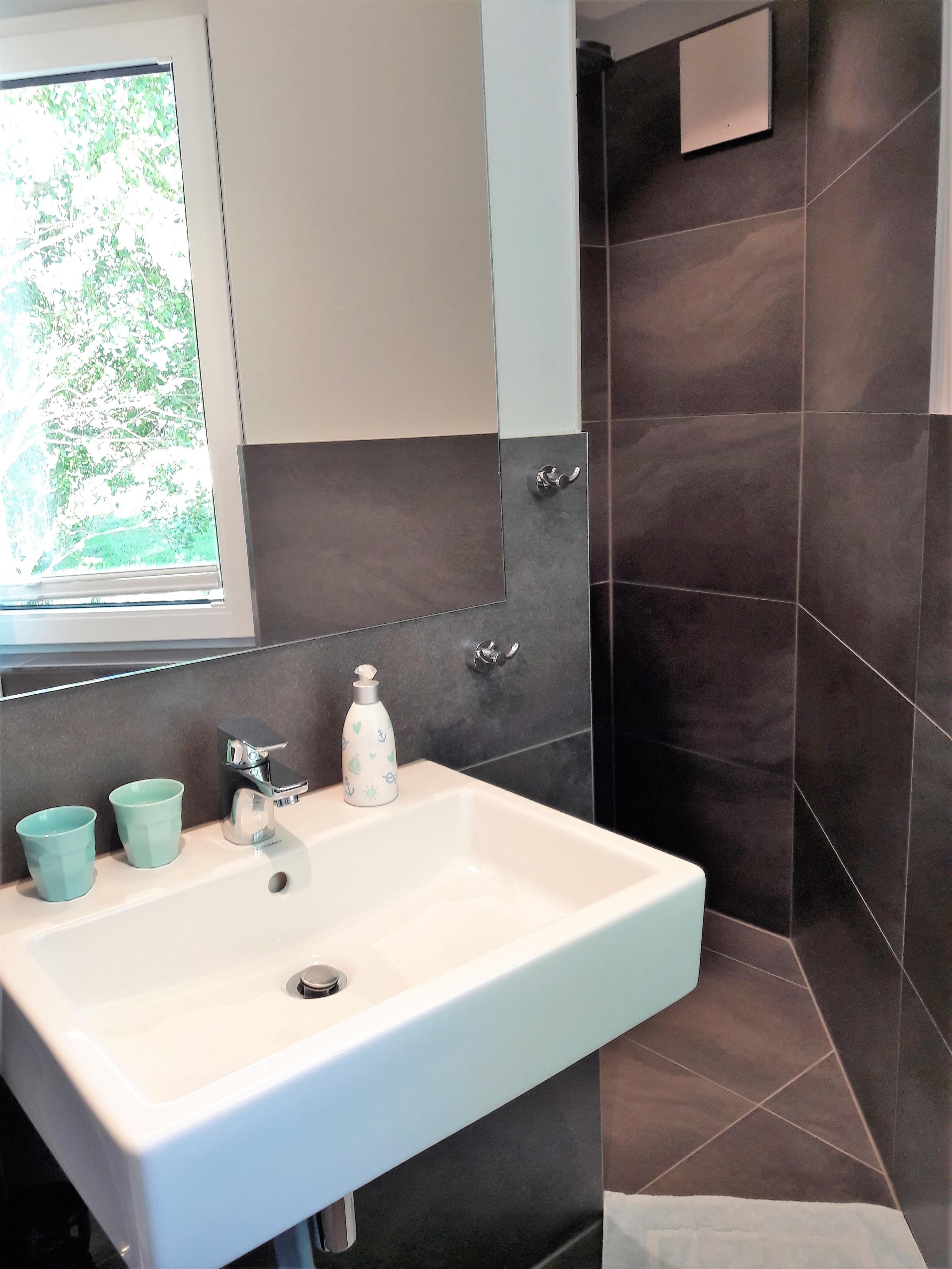 Im Erdgeschoss des ****-Ferienhauses liegen die beiden Schlafzimmer mit Doppelbett und TV ( im Eltern-Schlafzimmer) sowie das moderne Duschbad und ein Abstellraum mit Waschmaschine.