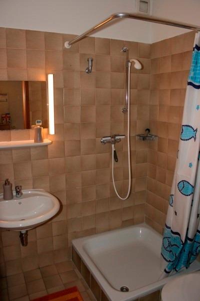 Das Bad verfügt über 1 Waschbecken, WC und Dusche.