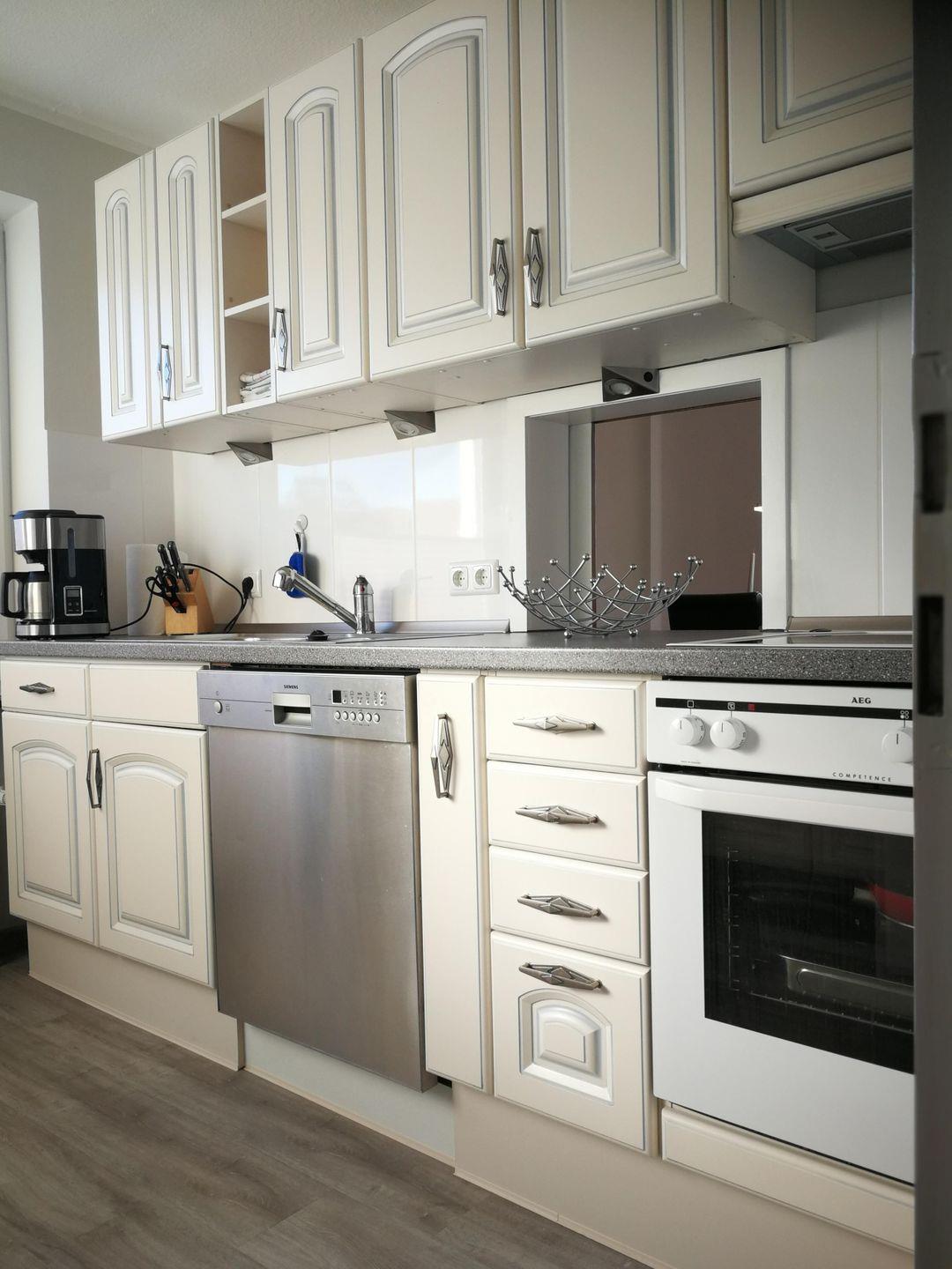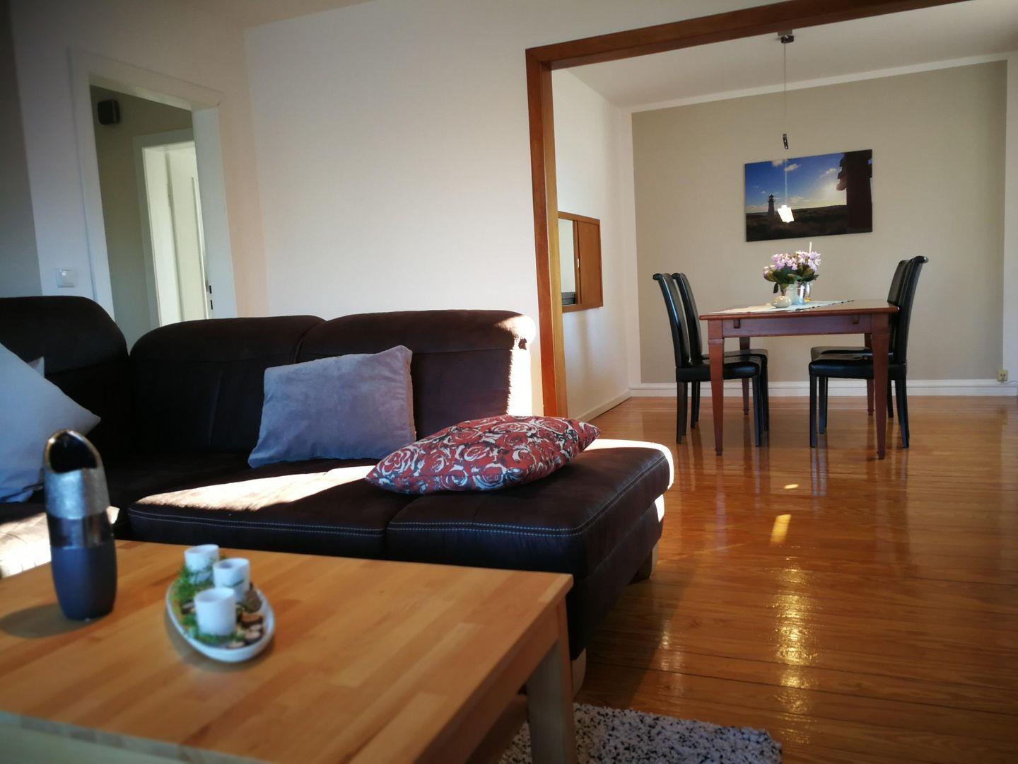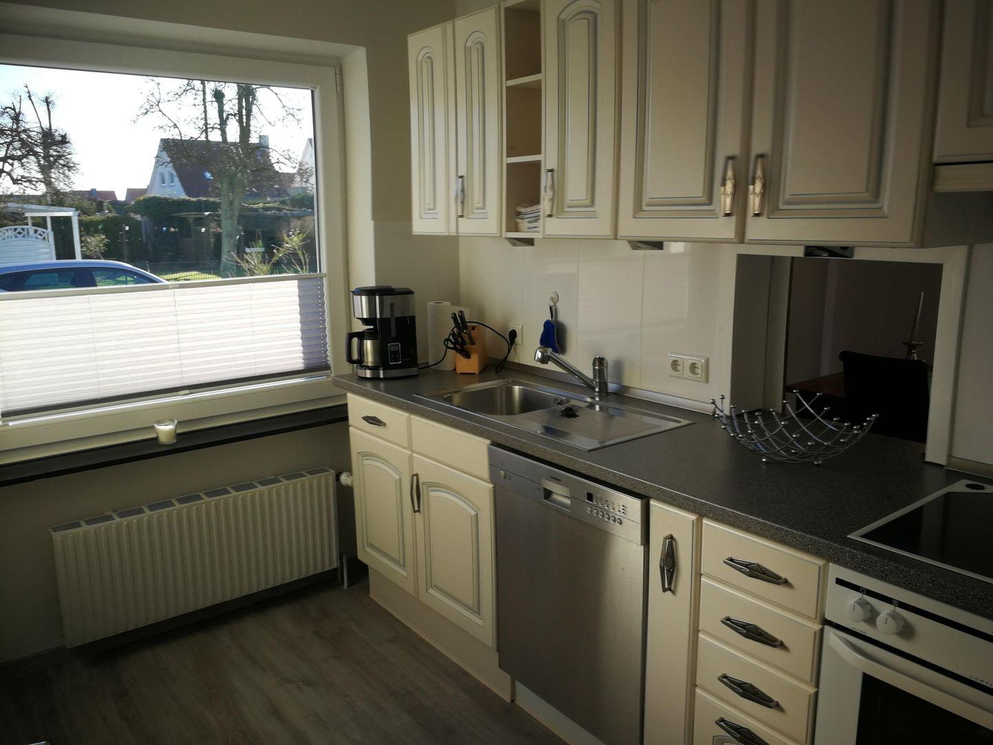 Der neu eingerichtete Wohnbereich der Ferienwohnung lädt zum Verweilen und Entspannen ein. Ein kleines Radio sowie SAT-TV sorgen für eine gute Unterhaltung. In der gesamten Wohnung ist ein leistungsstarkes kostenfreies w-lan vorhanden. Die integrierte Küche mit 4 Platten-Cerankochfeld und Backofen sowie Spülmaschine bietet Ihnen alle nötigen Annehmlichkeiten. Im Elternschlafzimmer erwartet Sie ein Doppelbett mit 2 Nachttischen und einem Kleiderschrank. Das zweite Schlafzimmer (ideal für Kinder) wurde mit zwei Einzelbetten ausgestattet. Für die Erfrischung steht Ihnen ein helles und freundliches Duschbad mit einem Handtuchtrockner zur Verfügung. Neben dem Duschbad befindet sich auch ein Gäste-WC. Wer nach einem anstrengenden Strand- oder Erkundungstag noch keine Lust hat in den 4 Wänden zu hocken, kann gern den Tag auf der eigenen möblierten Süd-West-Terrasse den Grill anschmeißen und den Tag ausklingen lassen. Ihren PKW oder Mietwagen können Sie gerne direkt am Haus ohne Mehrkosten abstellen. Falls Sie Ihre Fahrräder mitbringen oder welche mieten möchten, steht Ihnen ein abschließbarer Schuppen mit Lademöglichkeit für E-Bikes zur Verfügung.