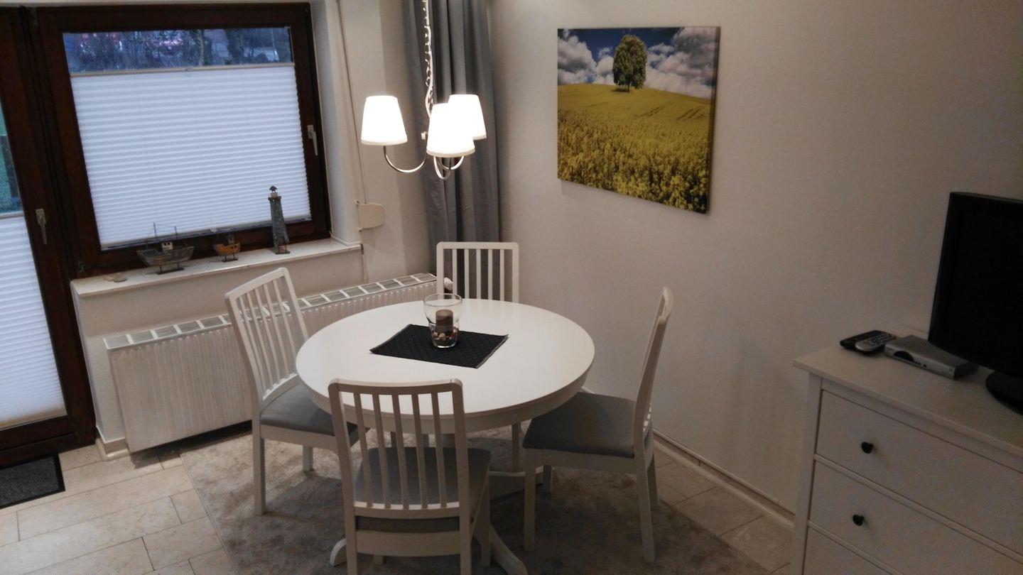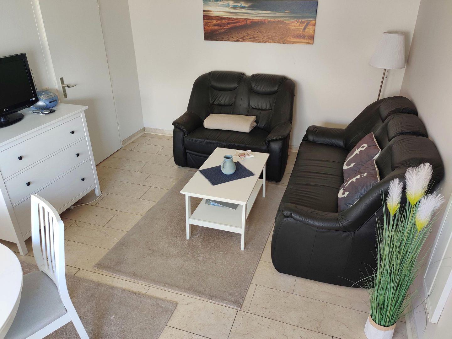 Der Wohnraum ist mit einer gemütlichen Leder-Sofagarnitur, einer Essecke und einem Flachbild Sat-TV ausgestattet. Die separate Küche ist komplett ausgestattet mit einem Elektroherd, Backofen, Mikrowelle, Kaffeemaschine, Toaster, Wasserkocher, Kühlschrank, Spülmaschine und Gefrierschrank. Es ist ausreichend Geschirr und Besteck vorhanden. Diese Küche lädt zum gemeinsamen Kochen ein.
