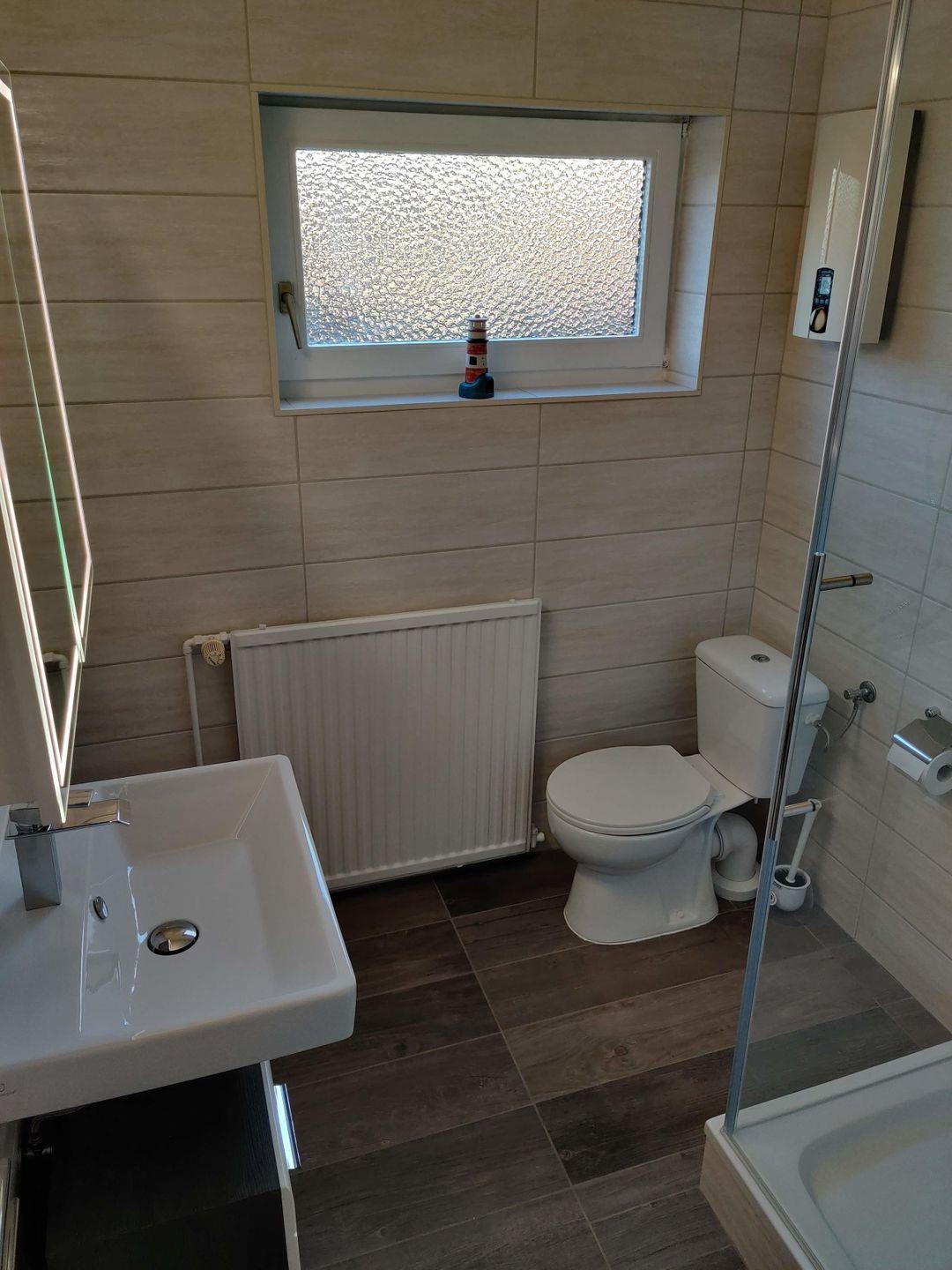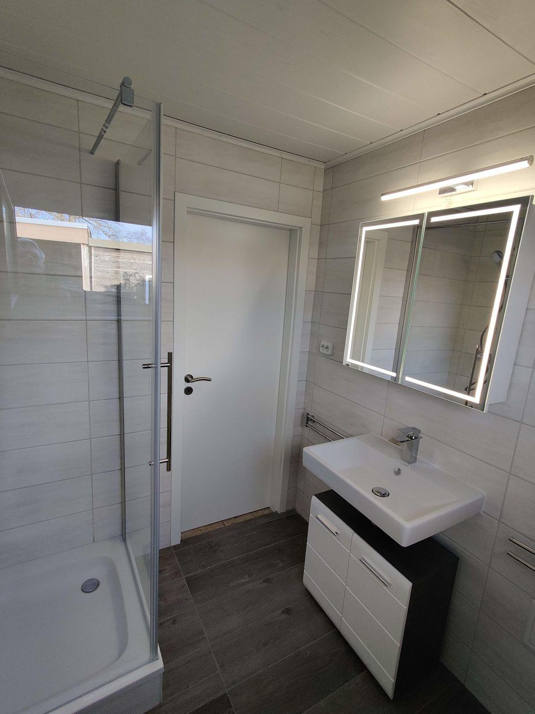 Das Badezimmer ist mit einer großzügigen Duschwanne ausgestattet.
