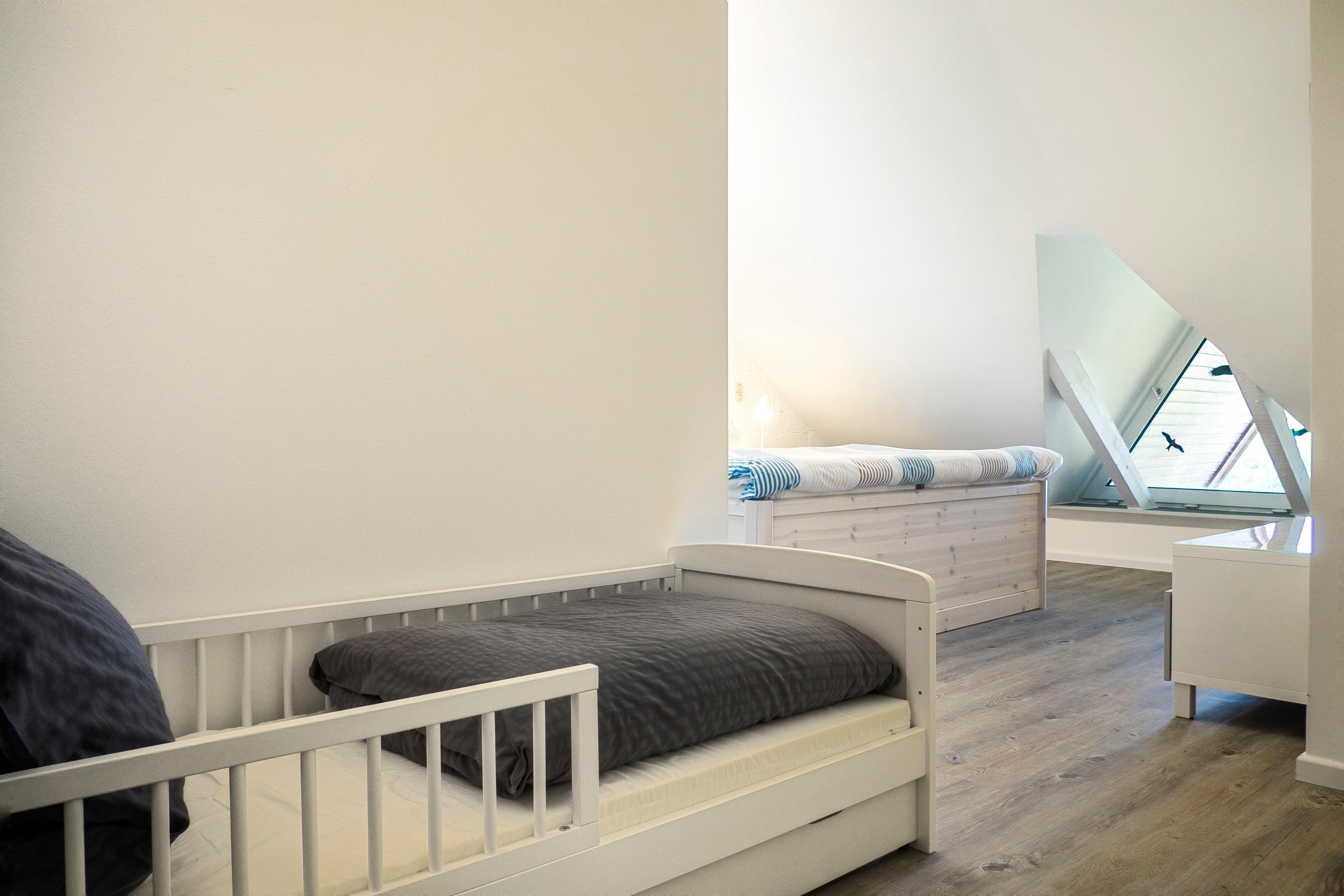 Schlafzimmer mit Doppelbett und Kinderbett im OG