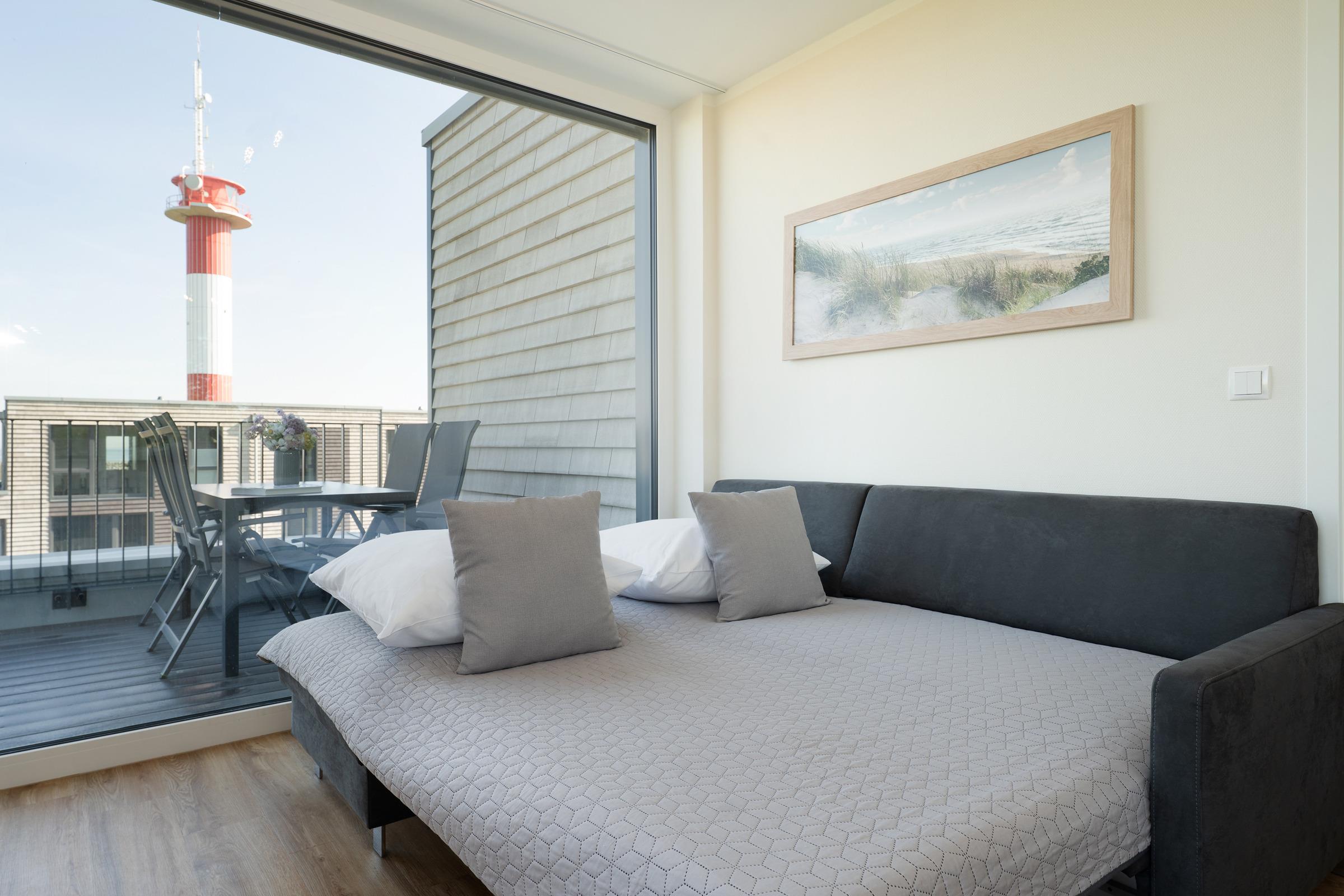 Das Schlafzimmer überzeugt mit einem komfortablen Doppelbett und ausreichend Stauraum. Zwei weitere Gäste kommen im Wohnzimmer auf einer gemütlichen Schlafcouch unter.
