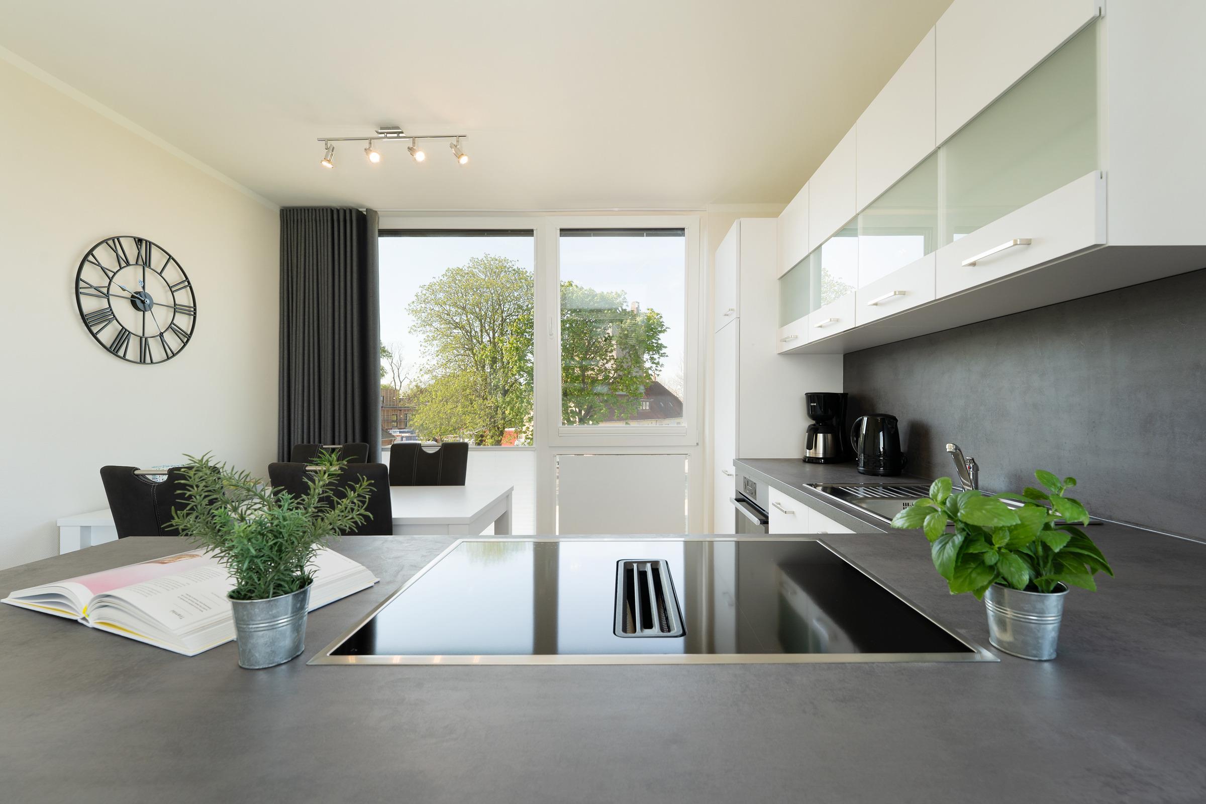 Die offene Küche ist mit allem ausgestattet, was Sie für Ihre Selbstverpflegung benötigen: Cerankochfeld, Backofen, Mikrowelle, Kühlschrank mit Gefrierfach und eine hochwertige Kaffeemaschine. Im Essbereich finden Sie Platz für gesellige Mahlzeiten.