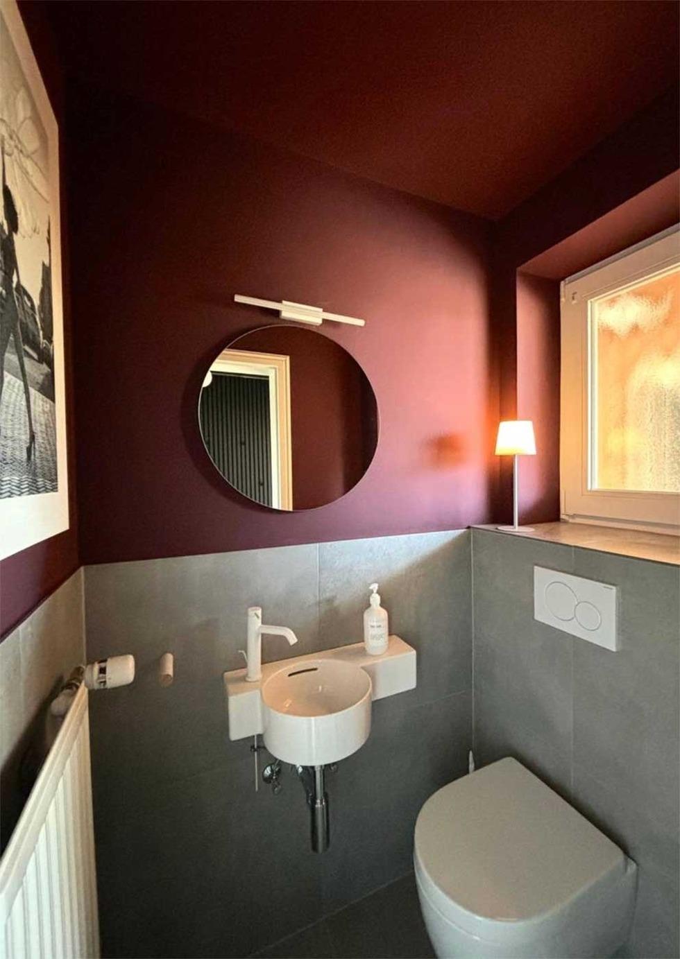 Neben einem Gästebad gibt ein großes Badezimmer mit einer Dusche und Waschmaschine.