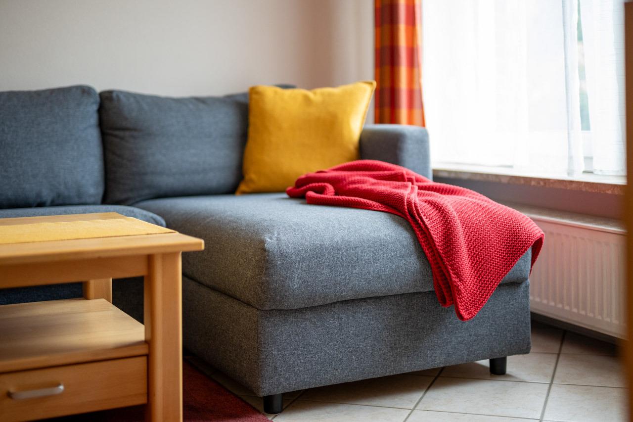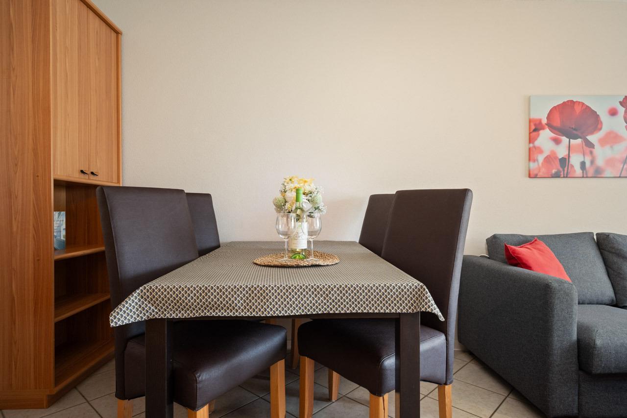 Passend zum Namen Mohnblume wurde die Wohnung mit roten Farbelementen eingerichtet. Das gemütliche Wohnzimmer mit Récamiere-Couch und der Essbereich laden zum Verweilen ein. Die separate Einbauküche mit Cerankochfeld, Backofen, Kühl- und Gefrierkombination sowie Geschirrspüler ermöglicht eine angenehme Selbstverpflegung. Zur Nachtruhe stehen Ihnen zwei Schlafzimmer - eins mit Doppelbett (160x190 cm) und eins mit zwei Einzelbetten (je 90x190 cm) - zur Verfügung. Das hell geflieste Duschbad rundet das Angebot ab.