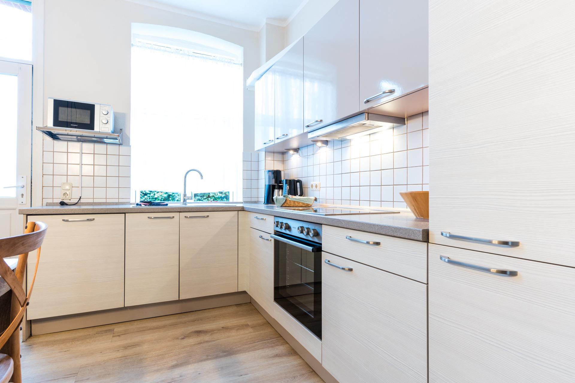Die Wohnküche mit Essplatz ist komplett ausgestattet mit allen Geräten und Utensilien, die Sie benötigen.
