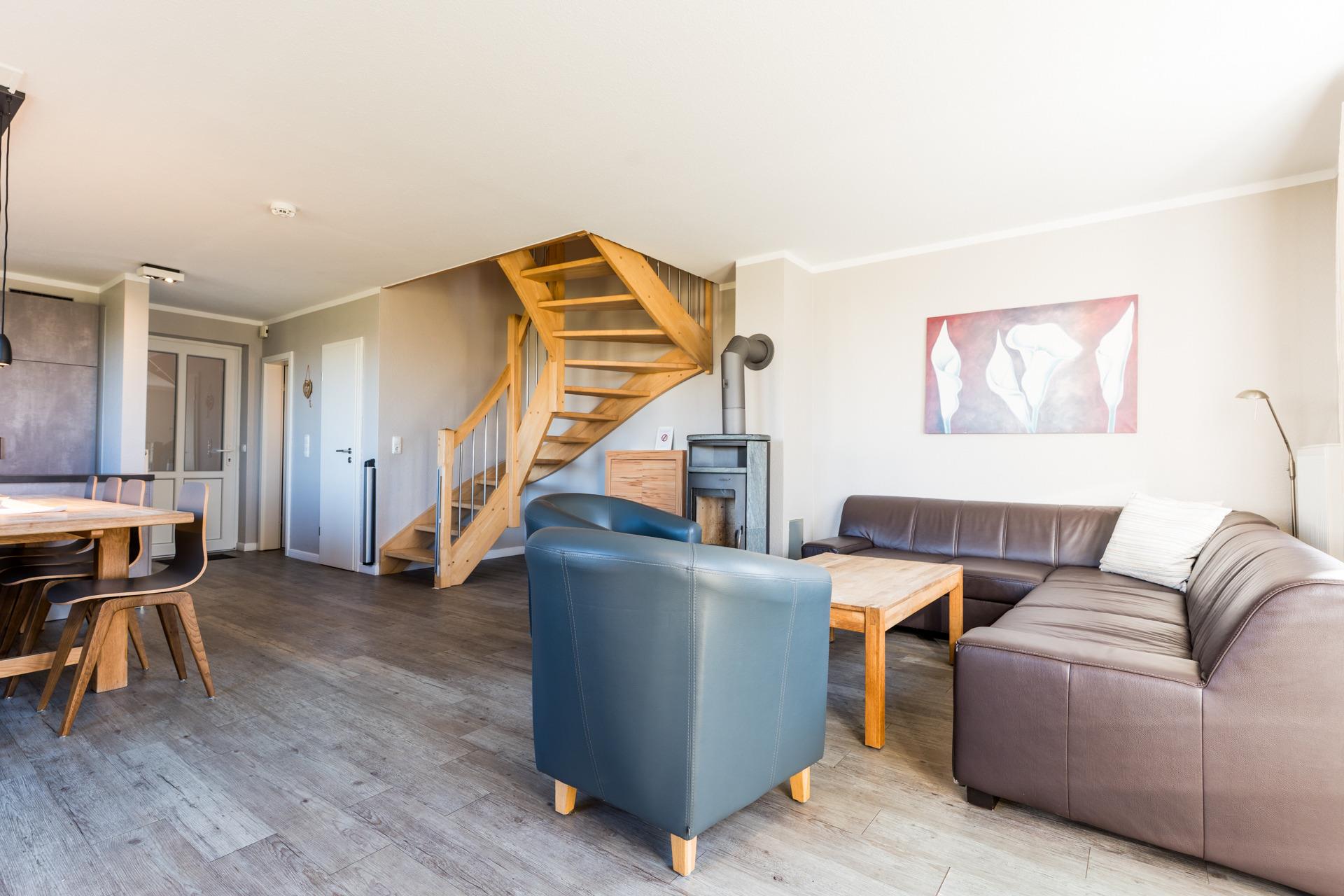 Ob Urlaub als Großfamilie oder mit Freunden – unsere 120m² großen Reihenhäuser bieten auf 3 Etagen Wohnfläche Raum für Erholung und gemeinsame Stunden. Mit 4 Schlafzimmern und 2 vollwertigen Duschbädern finden Sie Rückzugsmöglichkeiten für bis zu acht Personen. Sauna und Kamin sorgen für Entspannung und Gemütlichkeit.
