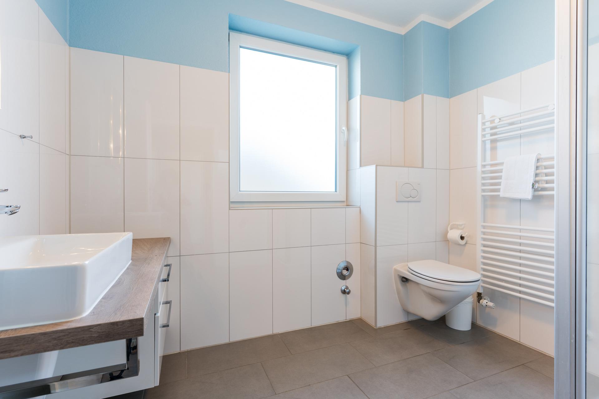 Die modernen Badezimmer mit Dusche verfügen über einen Handtuchheizkörper und Fußbodenheizung.