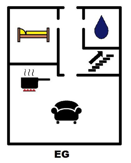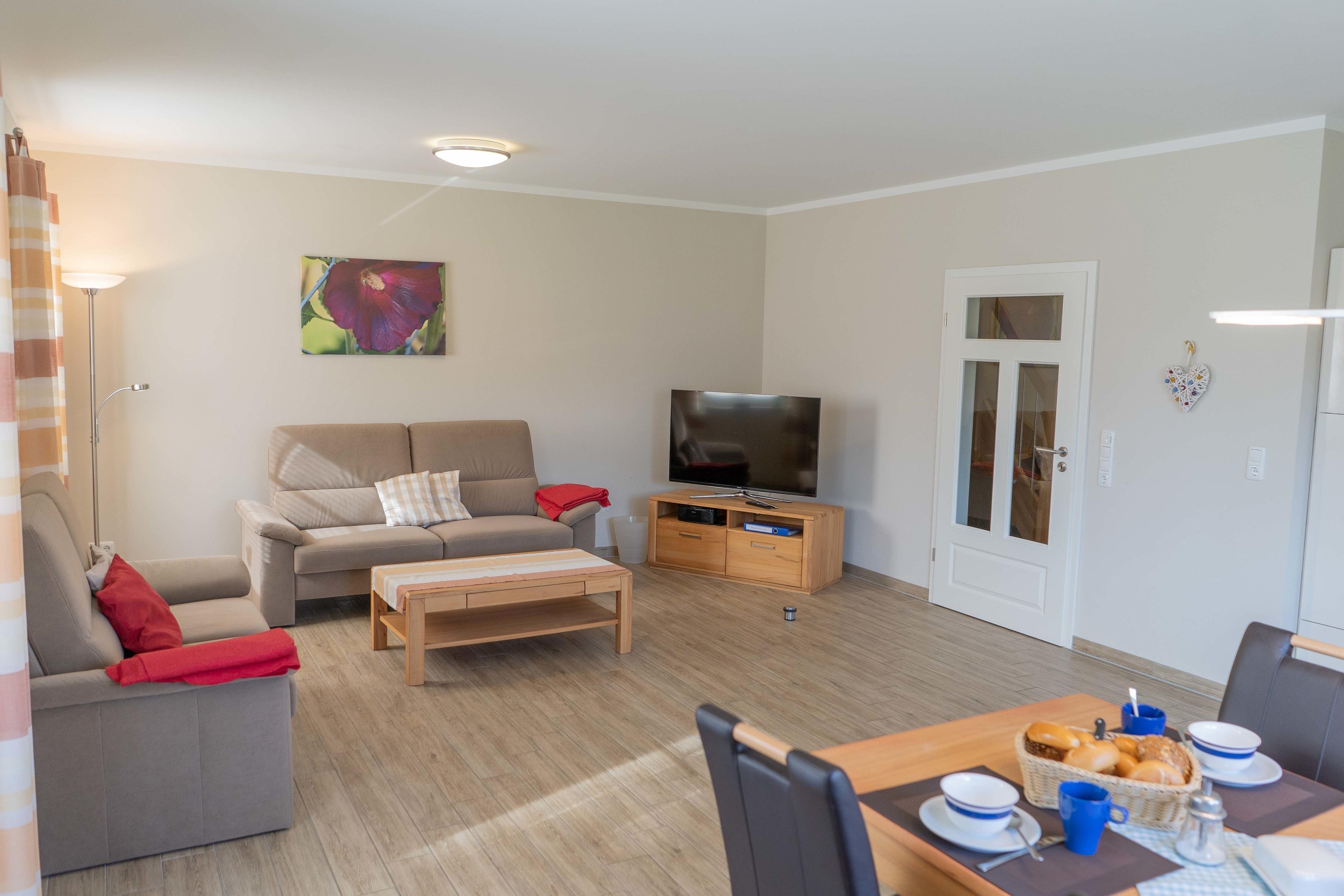 Wohnraum mit Sitzgruppe und Essplatz, WLan, Flachbildfernseher, direkter Zugang zur Südterrasse, voll ausgestattete Küche, Herd mit Ceran-Kochfeld und Backofen, Mikrowelle, Geschirrspüler, Tiefkühlfach, Kaffeemaschine, Wasserkocher, Toaster, Mixer usw.