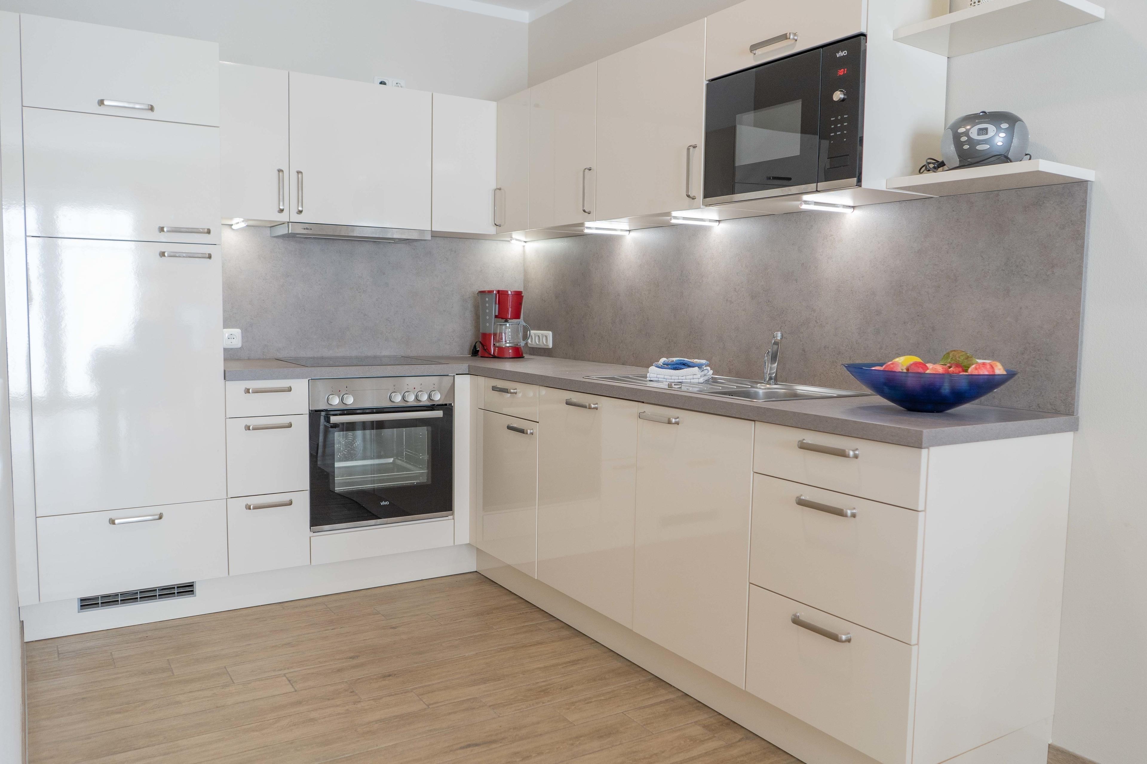 Wohnraum mit Sitzgruppe und Essplatz, WLan, Flachbildfernseher, direkter Zugang zur Südterrasse, voll ausgestattete Küche, Herd mit Ceran-Kochfeld und Backofen, Mikrowelle, Geschirrspüler, Tiefkühlfach, Kaffeemaschine, Wasserkocher, Toaster, Mixer usw.