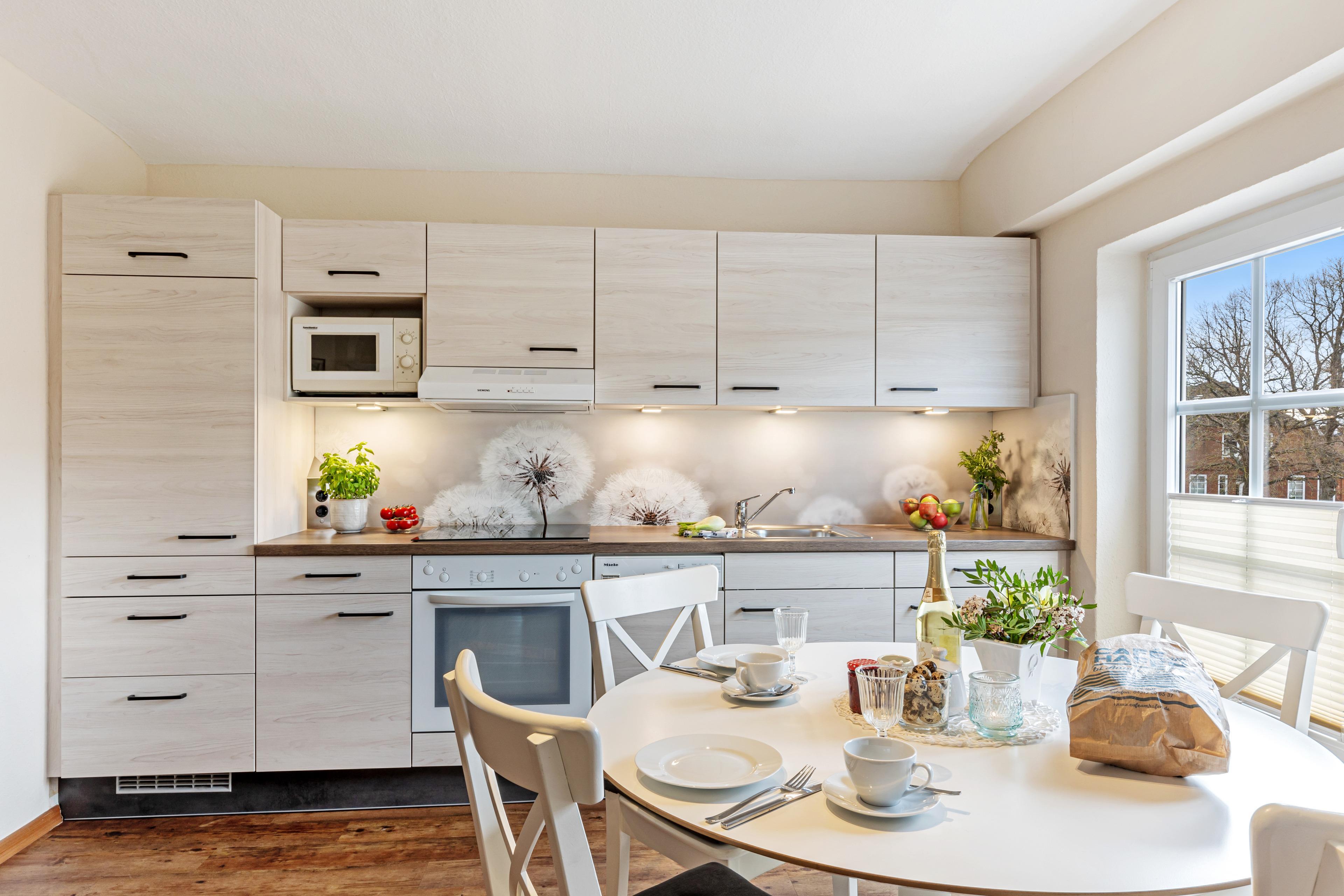 Im Wohnraum befindet sich eine vollausgestattete Küchenzeile (Geschirrspüler, Backofen, Mikrowelle),ein Sofa,TV-Schrank und ein Essplatz. Über den frz.Balkon blicken Sie Richtung Garten und Spielplatz. Mehrere Sitzmöglichkeiten im Garten sind vorhanden. Kinderausstattung erhalten Sie bei uns kostenfrei (bitte vorbestellen).