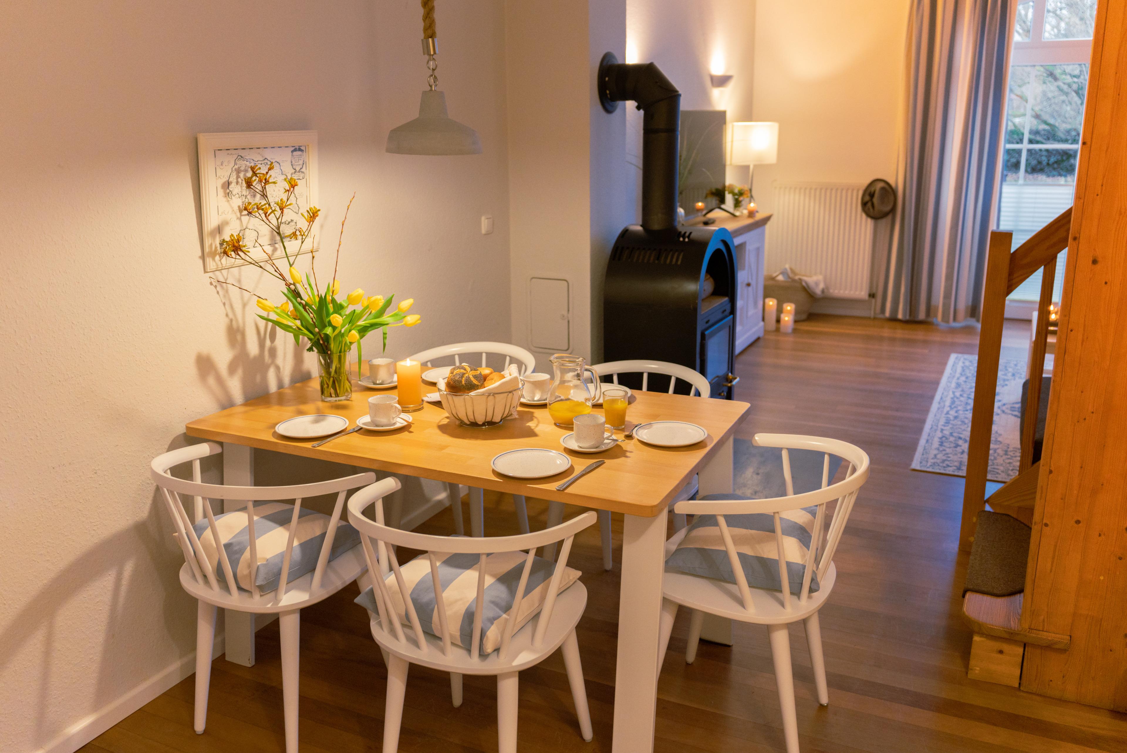 Willkommen im Scheuentrakt zur Dorfseite auf unserem 21ha großen Hof- und Gartengrundstück! Im Erdgeschoss Ihrer Ferienwohnung liegt der großzügige Wohn- Essraum mit Kaminofen und einer Küchenzeile sowie ein separates WC. Auf der gemütlichen Terrasse Richtung Westen können Sie das gute Wetter auf Fehmarn in vollen Zügen genießen. In der ersten Etage befindet sich eine Schlafgalerie, ein Schlafraum und ein Duschbad.