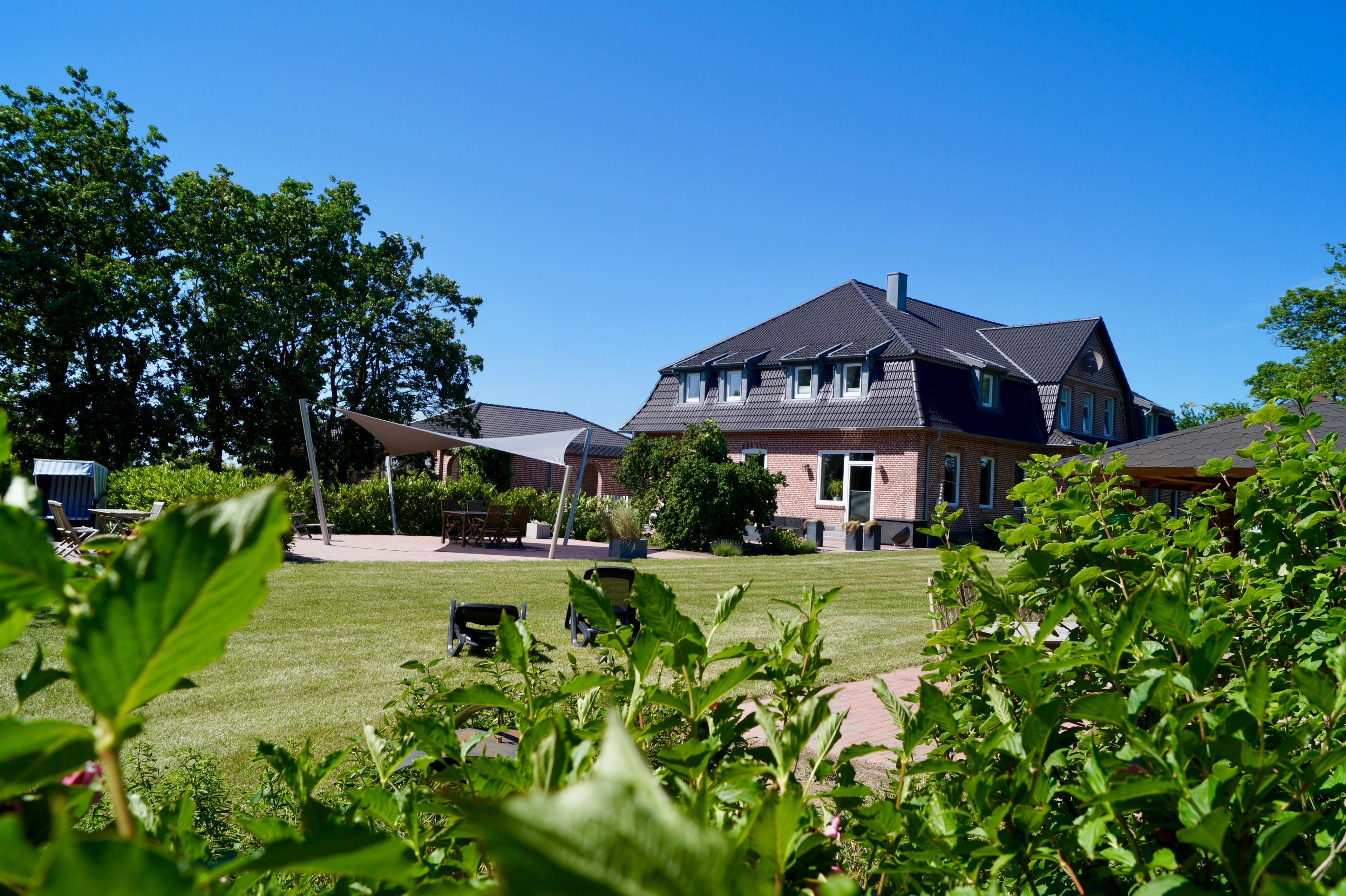 Das Bauernhaus steht in einem parkähnlichen Garten. Dieser hat eine Vielzahl von Sitzplätzen und Rückzugsmöglichkeiten.