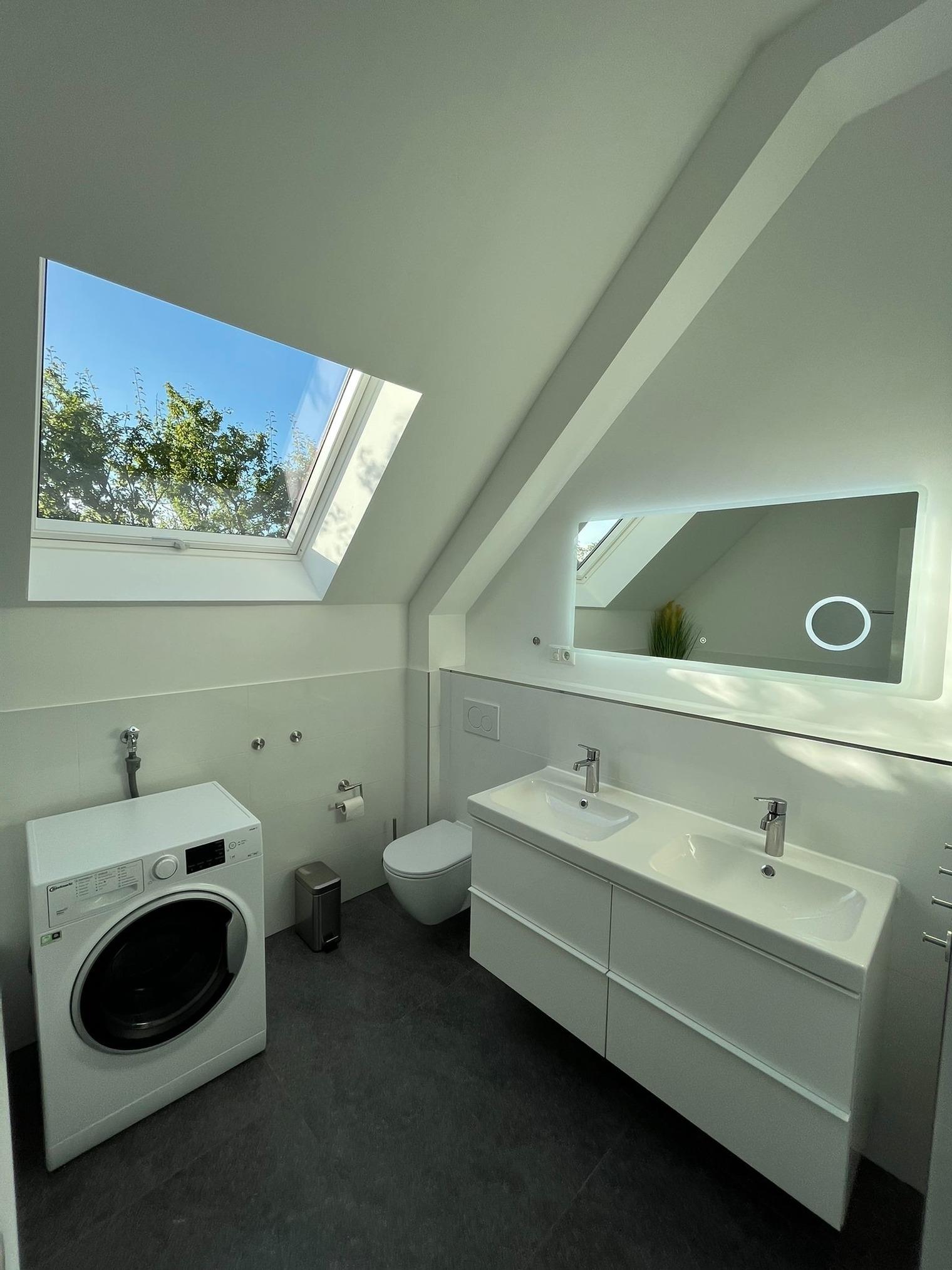 OG: 1 Schlafzimmer mit Doppelbett 160x200 (2x80cm Matratzen) mit Platz für ein mitgebrachtes Babybett. Schlafzimmer 2 mit Etagenbett für 3 Personen(140x200 und 90x200) ausgestattet mit großem Smart-TV. Das Tageslicht-Bad verfügt über Doppelwaschplatz, große Dusche, Badewanne und Waschtrockner.