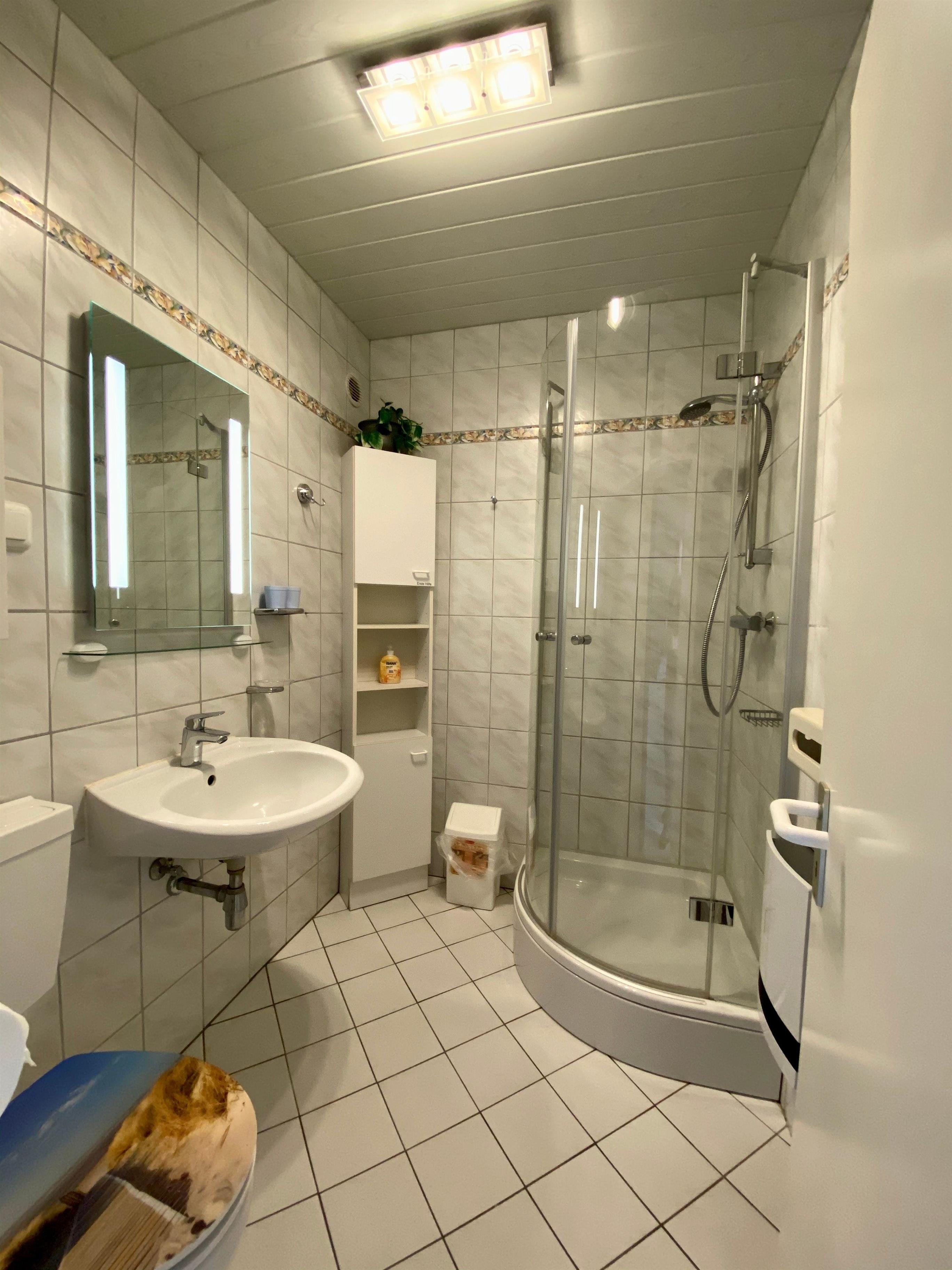 Das Duschbad mit WC ist, ebenso wie der Eingangsbereich und Küchenzeile, hell gefliest.