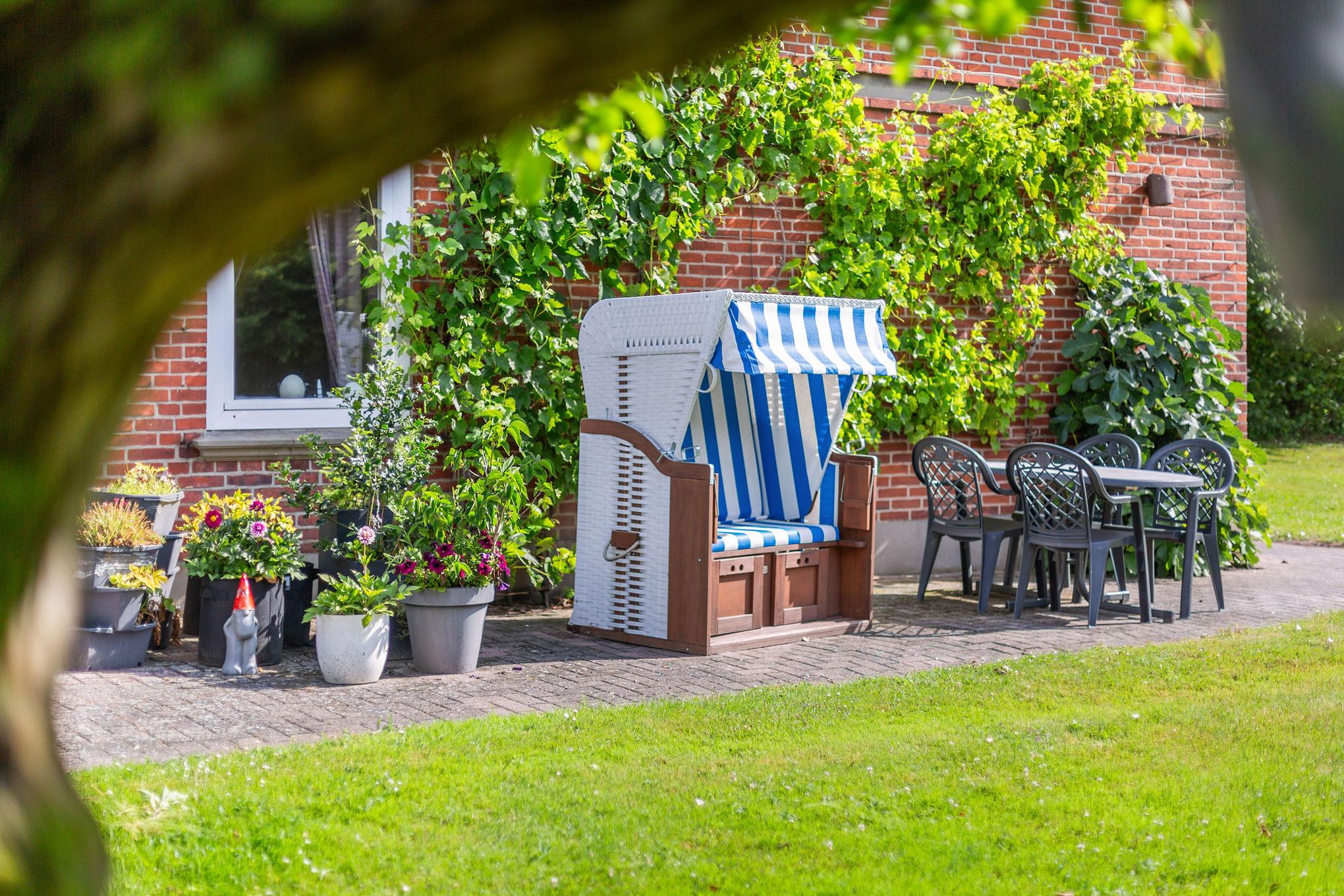 Von der Wohnung aus genießen Sie einen wunderschönen Blick in den Garten. Auf der gemeinschaftlich nutzbaren Terrasse können Sie entspannte Stunden verbringen, ideal zum Frühstücken, Lesen oder einfach die frische Meeresluft genießen.