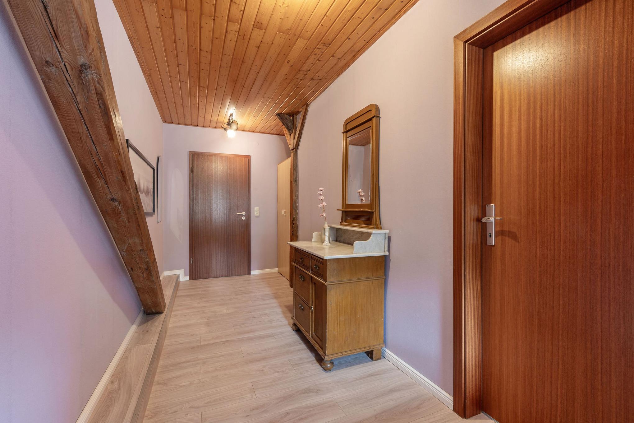 Die Wohnung liegt in einem charmanten ehemaligen Bauernhaus, dessen rustikale Holzbalken erhalten geblieben sind und für eine besonders warme und authentische Atmosphäre sorgen.