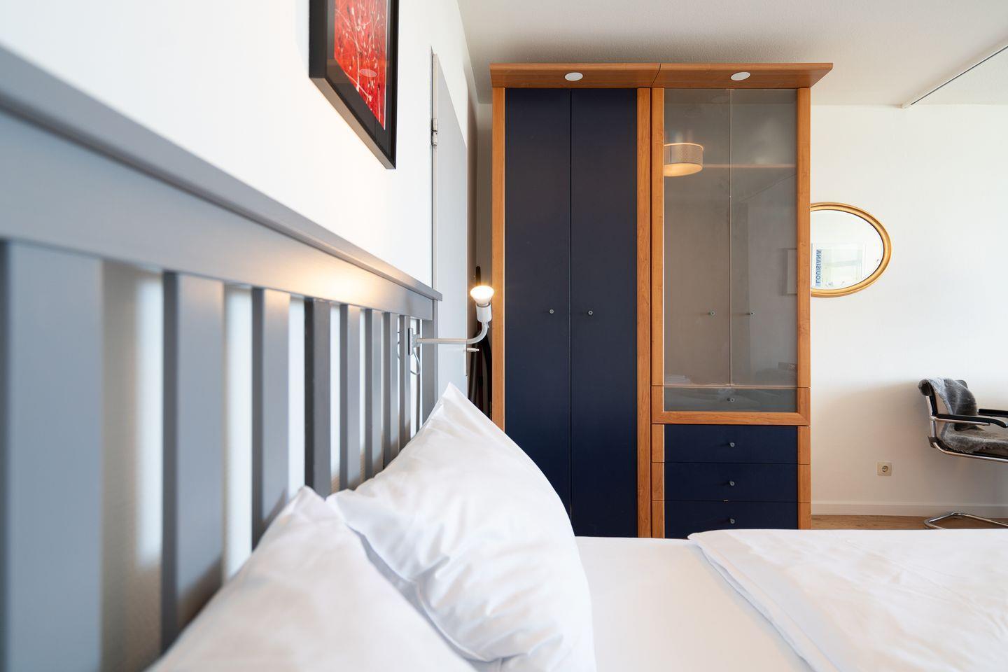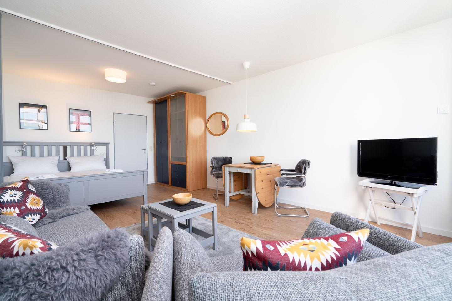 Auf 34?m² bietet die Wohnung Platz für zwei Personen und ist damit ideal für Paare oder Alleinreisende, die Ruhe, Meerblick und Komfort zu schätzen wissen. Der moderne Wohn- und Schlafraum vereint Gemütlichkeit und Funktionalität: mit einem bequemen Doppelbett, einem hellen Essbereich und einer stilvollen Einrichtung, die sofort Urlaubsstimmung aufkommen lässt.