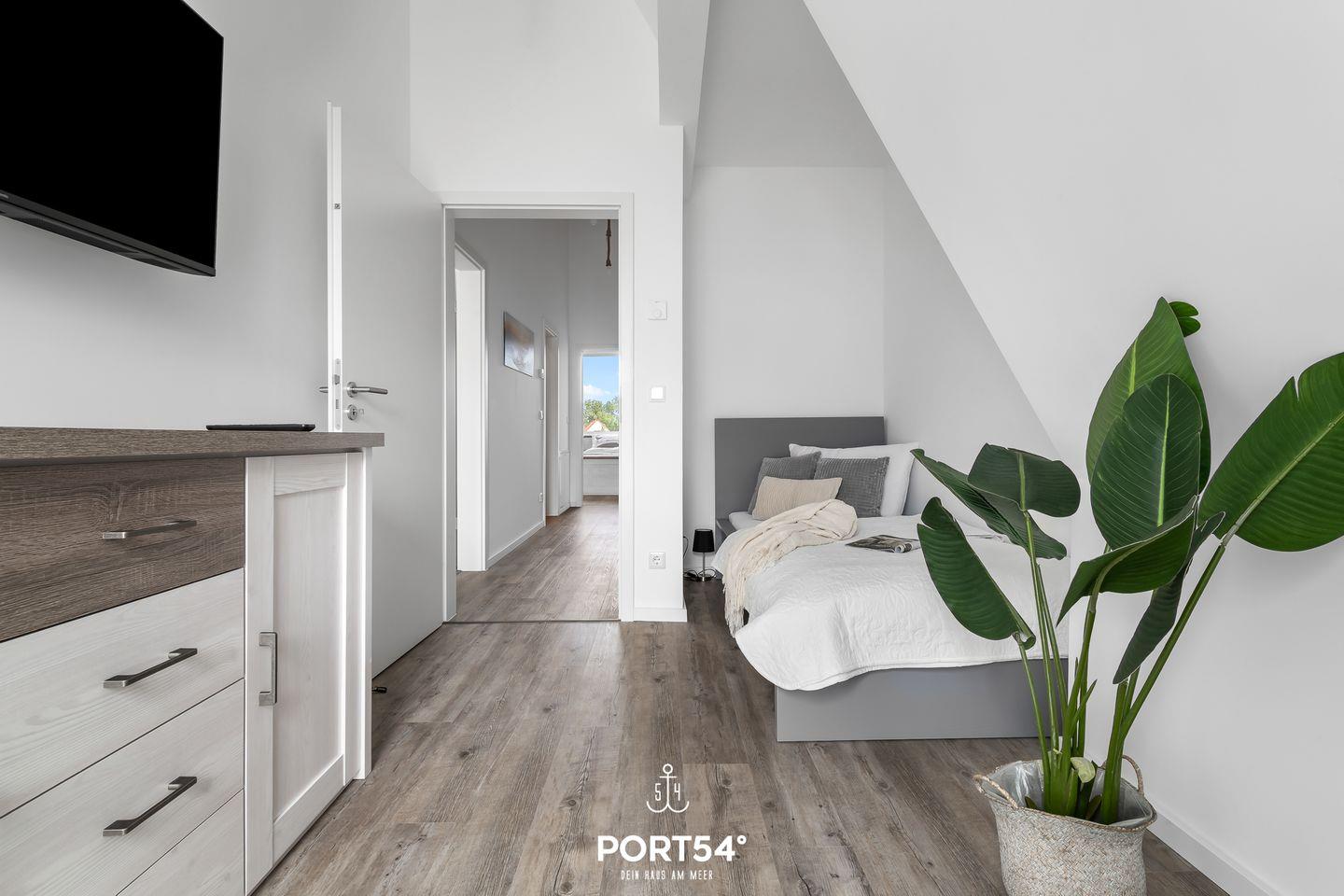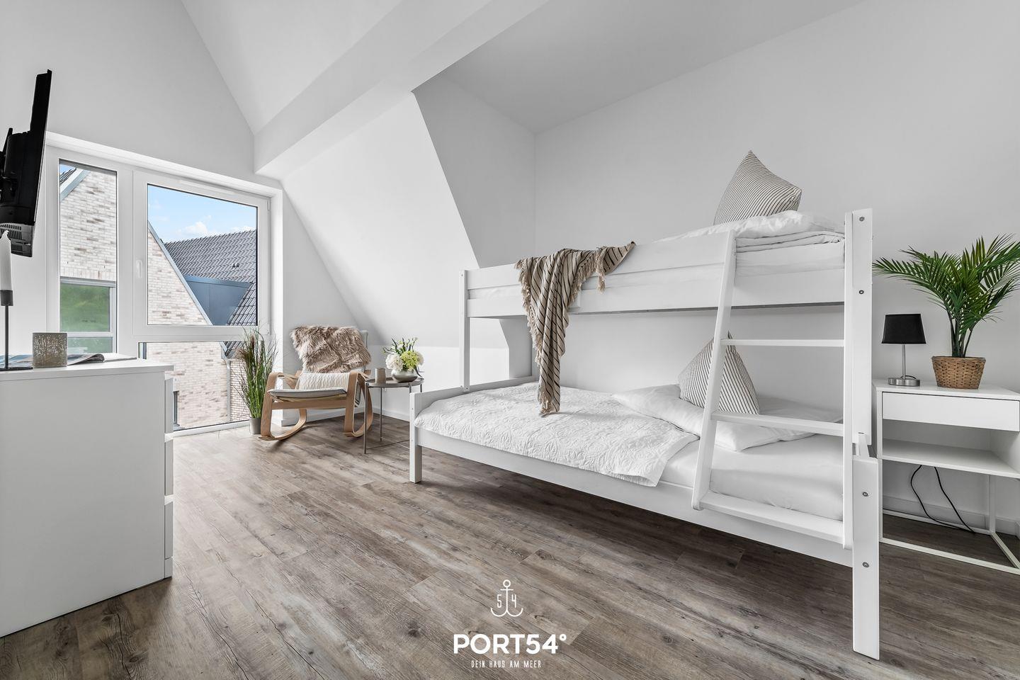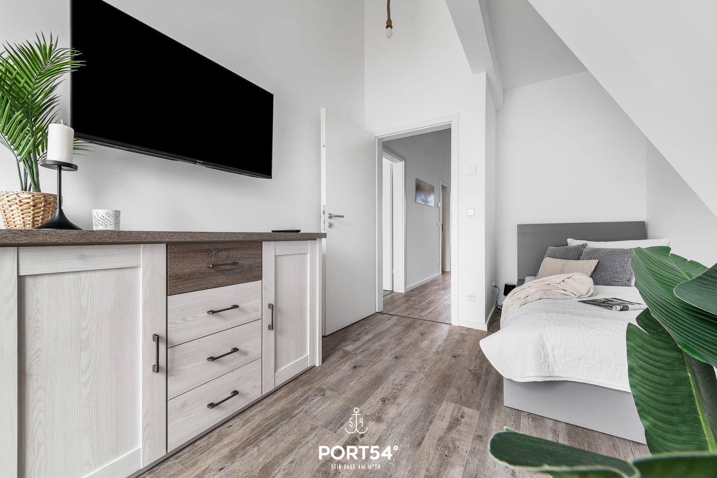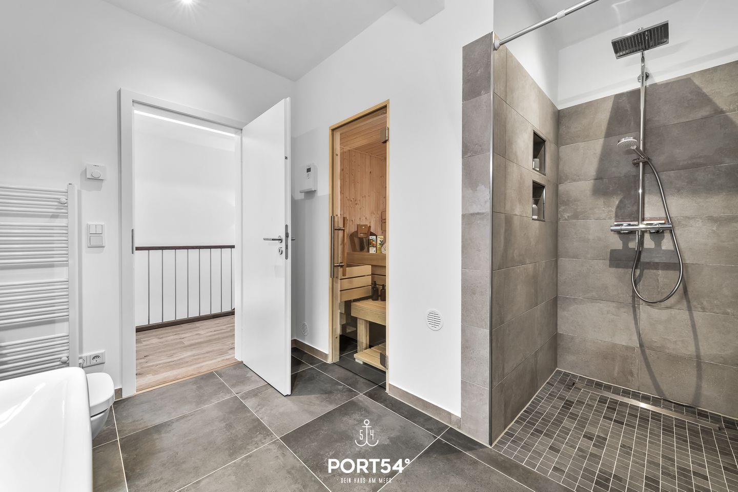 Im Obergeschoss erwarten Sie drei Schlafzimmer ( erstes Schlafzimmer mit Doppelbett 180x200, zweites Schlafzimmer mit einem Etagenbett, wobei die obere Matratze 90x200 misst und die Untere 120x200, drittes Schlafzimmer ein Einzelbett (100x200) sowie das luxuriöse Badezimmer mit Finnischer Sauna.