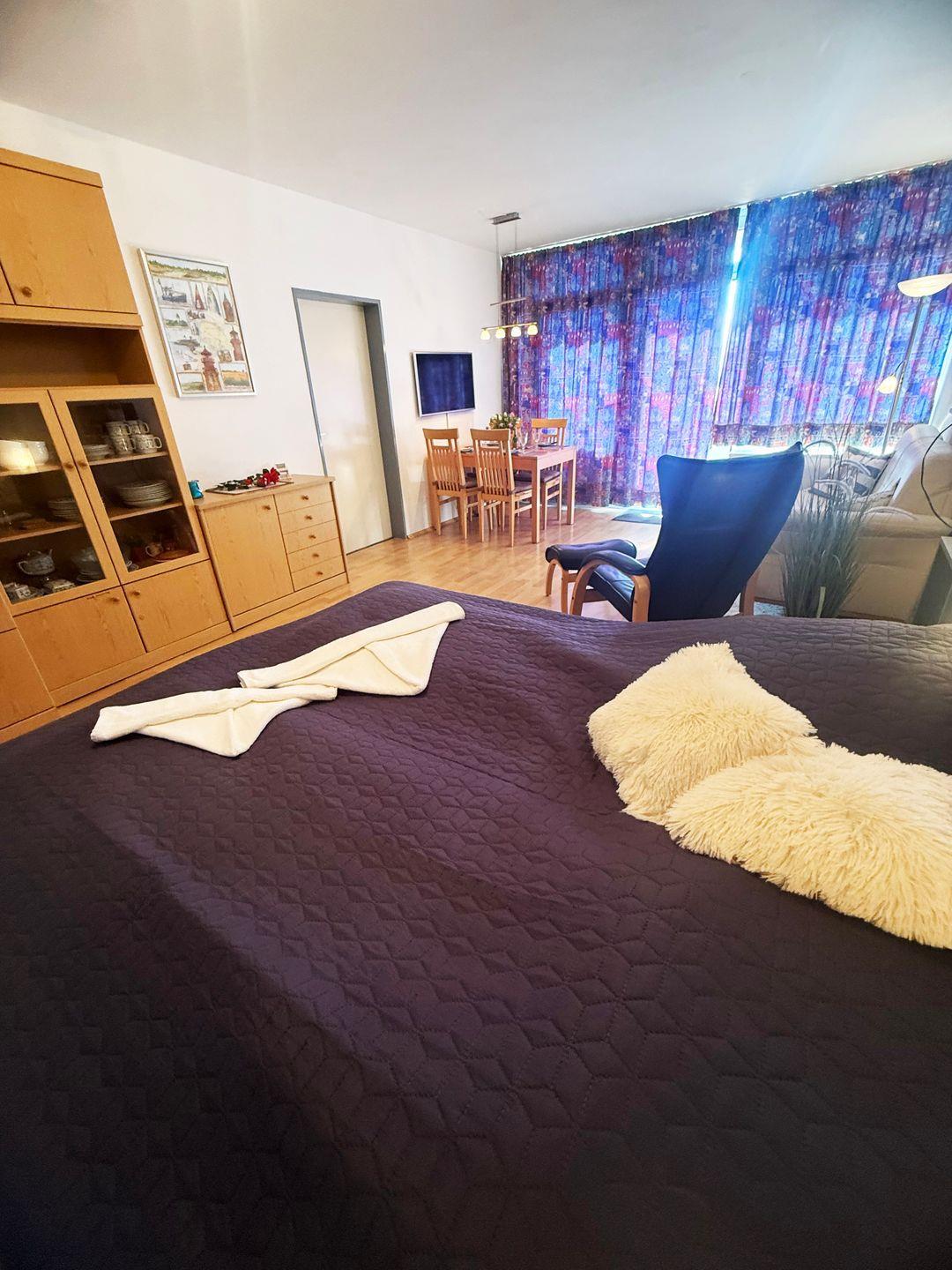 Doppelbett (160x200) mit LED-Leselampen, Flat Screen-TV, Schlafsofa, Esstisch Kleiderschrank, Sideboard, Spiele, Bücher