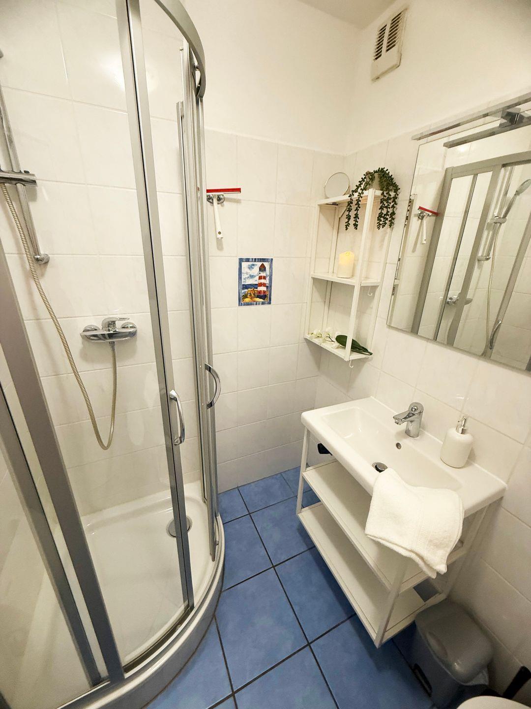 Dusche, Waschbecken, Spiegel, gute Beleuchtung, WC, Regal, Handtuchaufhänger, Fön