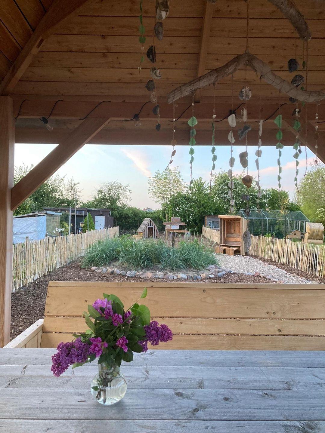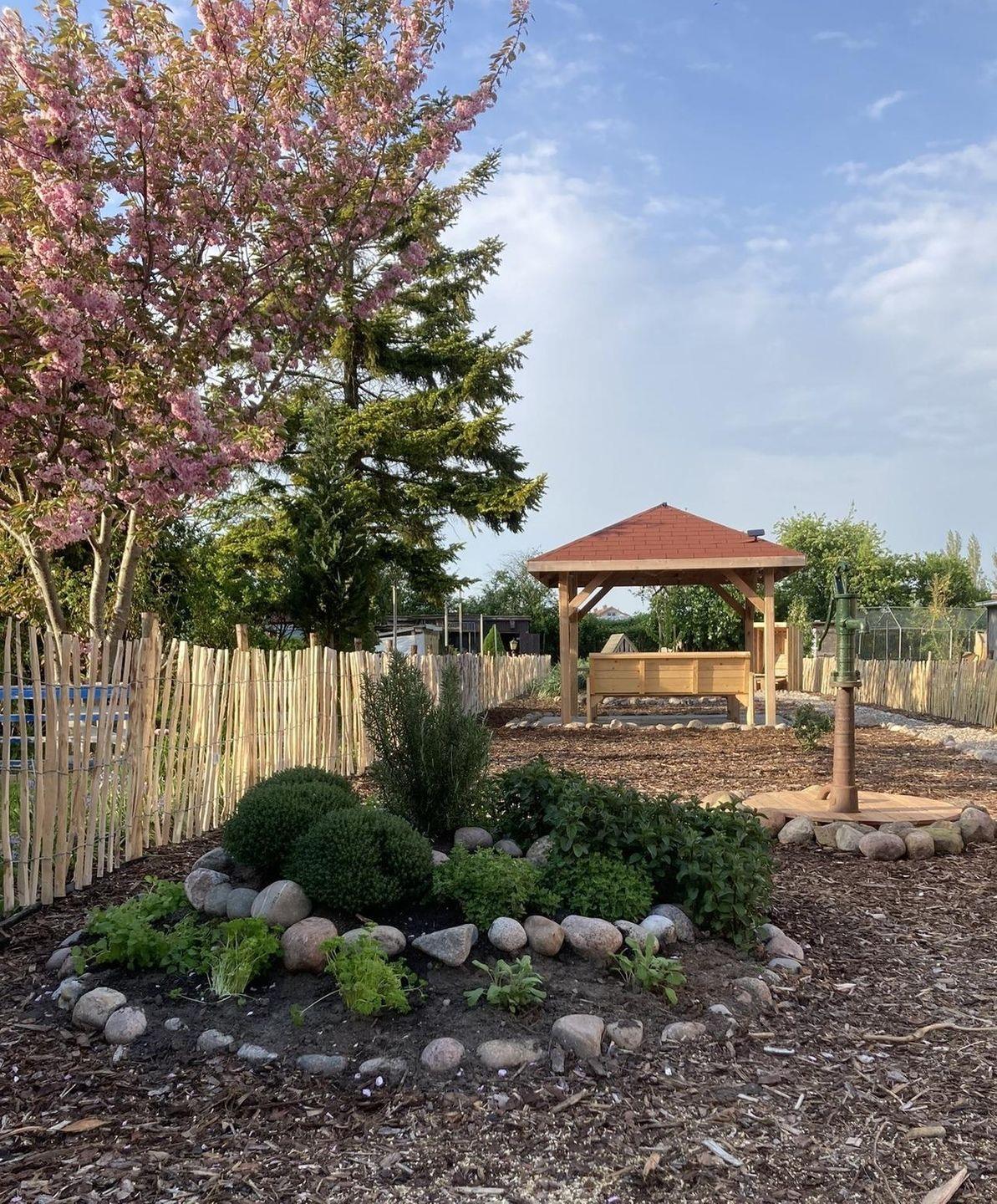 Strandkorb, Pavillon mit 8 Sitzgelegenheiten, Schwenkgrill, Feuerschale, Kinderhaus mit Naschgärtchen, Schwengelpumpe mit Brunnenwasser, 2 Holzpferde