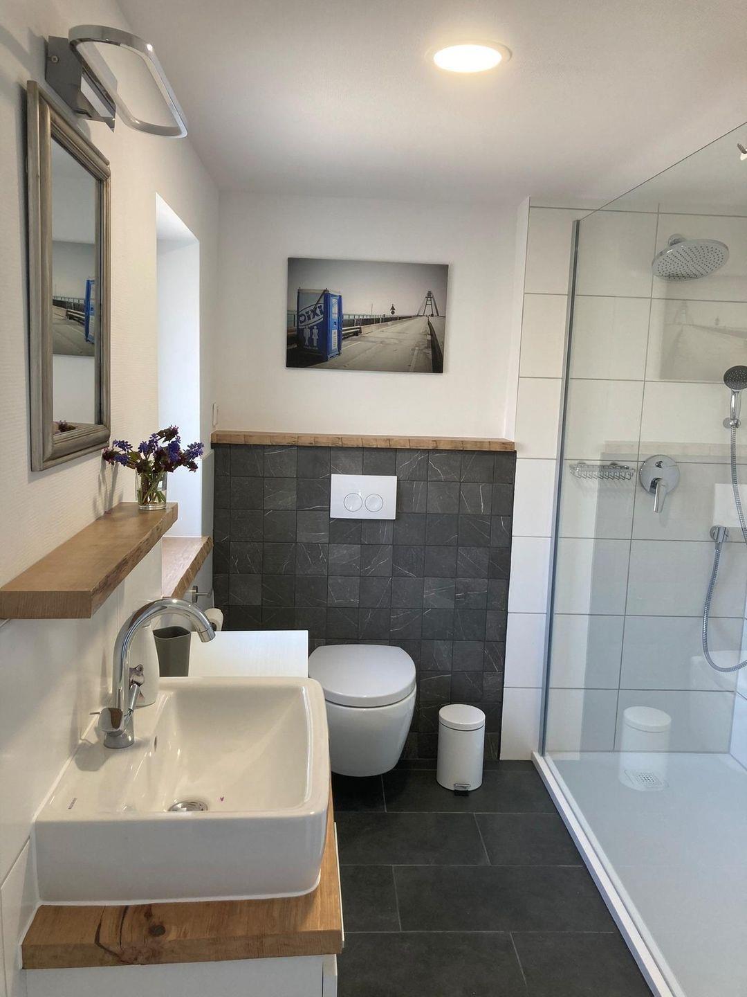 Offene Dusche 80x 160 cm, Waschtisch, Fensterbank und Ablagen aus altem aufgearbeiteten Holz (Original Flüsterhölzer), Toilette, Regal