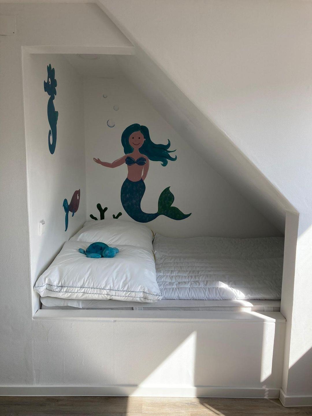Ein Traum, im wahrsten Sinne des Wortes, ist der Kojenschlafplatz, der dem Haus mit seiner ansprechenden Wandbemalung seinen Namen gibt "Ferienhaus kleine Meerjungfrau". Wenn dann die Schildkröte, wahlweise Meeresrauschen oder beruhigende Musik spielt und sanftes, blaues LED-Licht Unterwassereffekte an die Wand zaubert, fühlen sich die Kinder wie kleine Meermädchen und Meerjungen und werden sanft in den Schlaf geleitet.