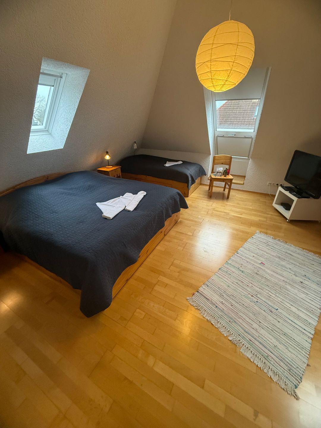 1 Schlafzimmer mit Doppelbett und Einzelbett sowie TV im Dachgeschoss