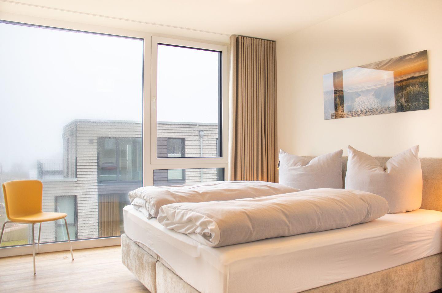 Das Schlafzimmer bietet mit seinem bequemen Boxspringbett, bodentiefen Fenstern und Verdunkelungsmöglichkeiten den idealen Ort für erholsame Nächte. Harmonische Farben und durchdachte Einrichtung sorgen für Gemütlichkeit. Im Wohnbereich steht dir bei Bedarf ein Schlafsofa für zwei Kinder zur Verfügung – ideal für Familien mit Nachwuchs. Alle Betten sind mit durchgehenden Matratzen ausgestattet.