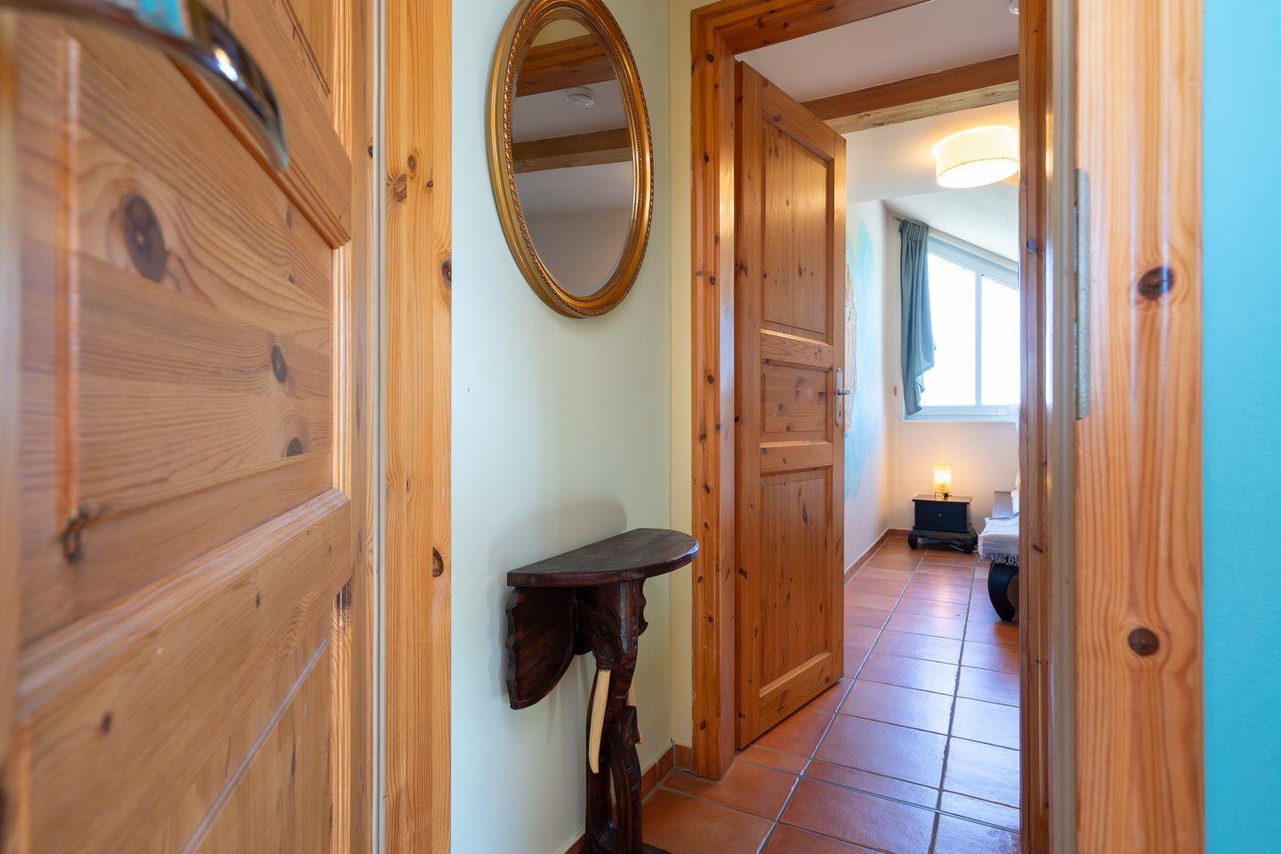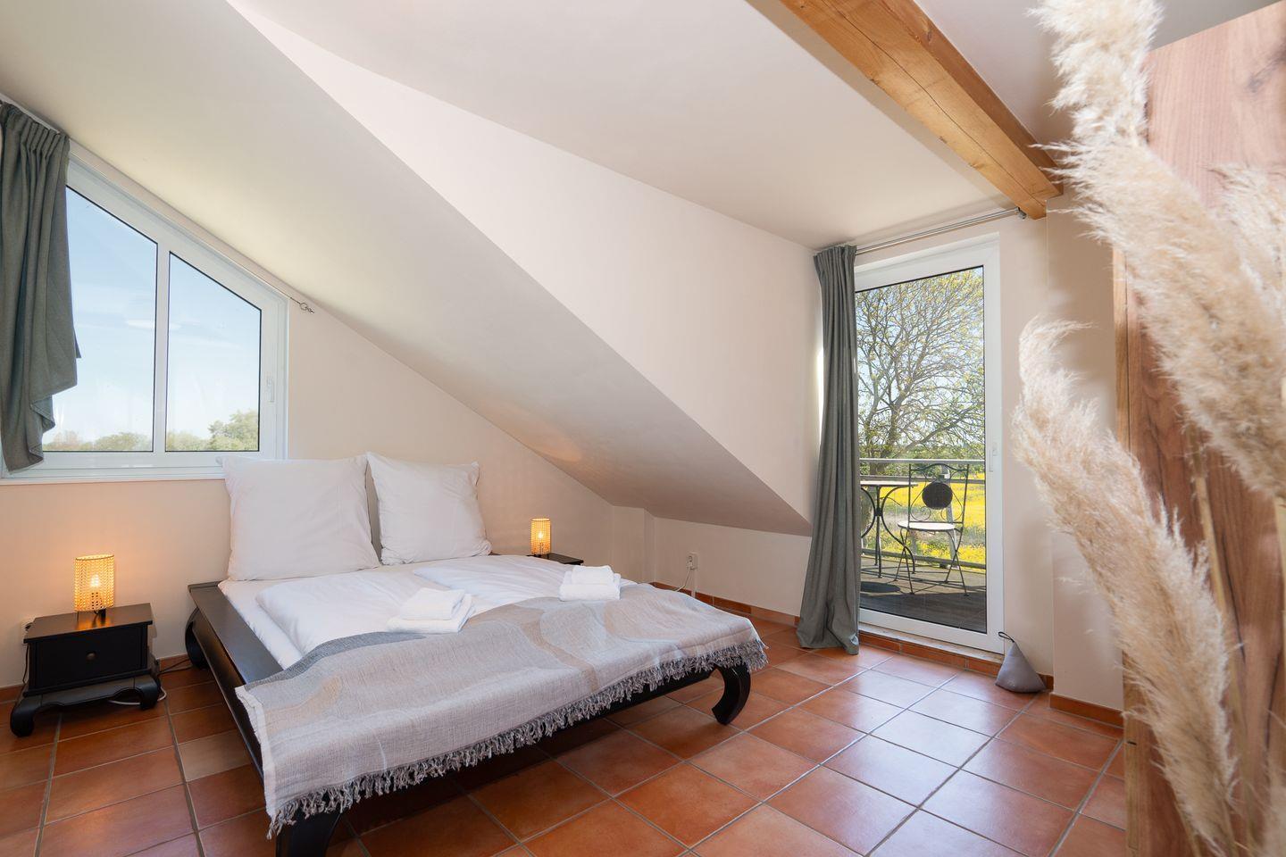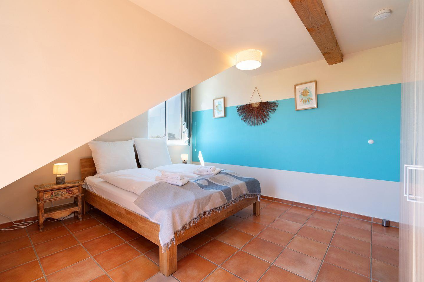 Über eine Treppe gelangen Sie in den oberen Bereich, wo zwei komfortable Schlafzimmer auf Sie warten. Das rechte Schlafzimmer verfügt über ein gemütliches Doppelbett und einen eigenen Balkon mit herrlichem Meerblick. Auch das linke Schlafzimmer bietet ein Doppelbett sowie einen Zugang zu einem weiteren Balkon – so genießen Sie von mehreren Seiten den einzigartigen Ausblick.