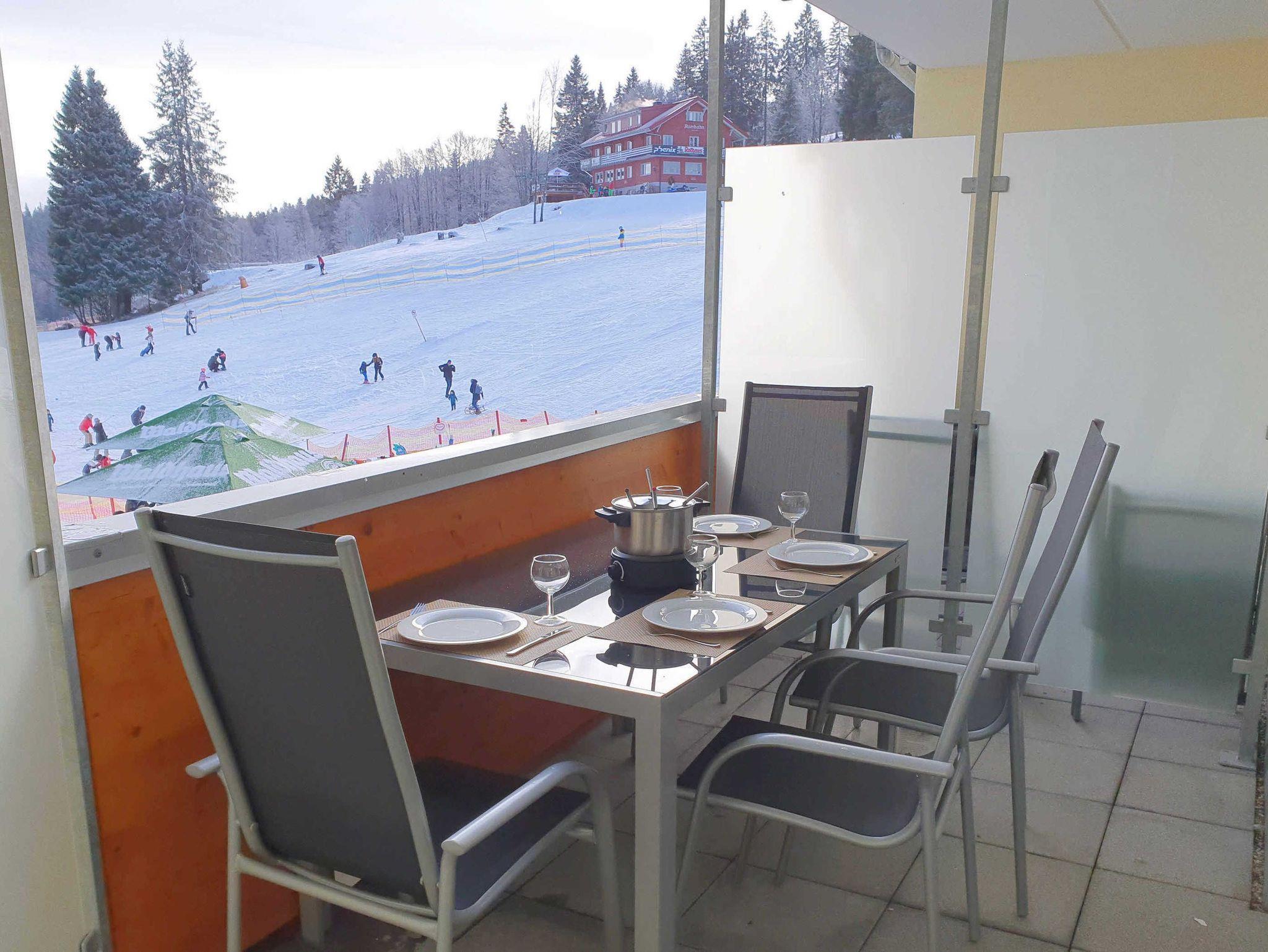 Wir laden Sie ein, Ihren Urlaub in diesem komfortablen 2-Zimmer-Appartement für bis zu 4 Personen zu verbringen. Die Ferienwohnung auf dem Feldberg verfügt über einen Wohnraum mit offener, voll ausgestatteter Küche (Geschirrspüler, Kaffee und Nespresso Kapselmaschine, Fondue, Smoothie Maker, u.v.m.) sowie einer Sitzecke mit Couch, die sich schnell zu einem gemütlichen Doppelbett umbauen lässt. Des Weiteren stehen ein SAT-Smart-TV und eine Kompaktstereoanlage (CD, Radio, Bluetooth) für Sie zur Verfügung.