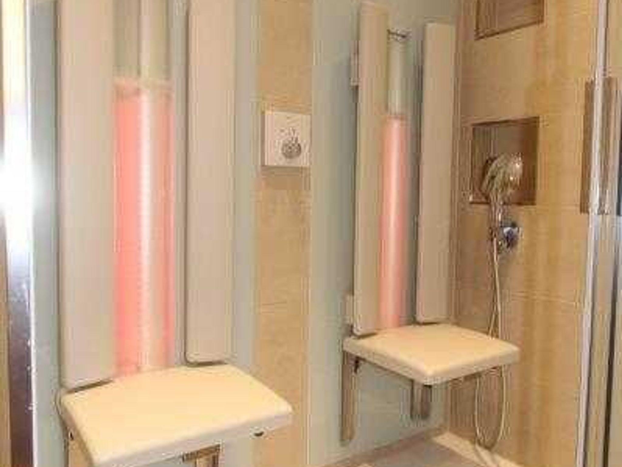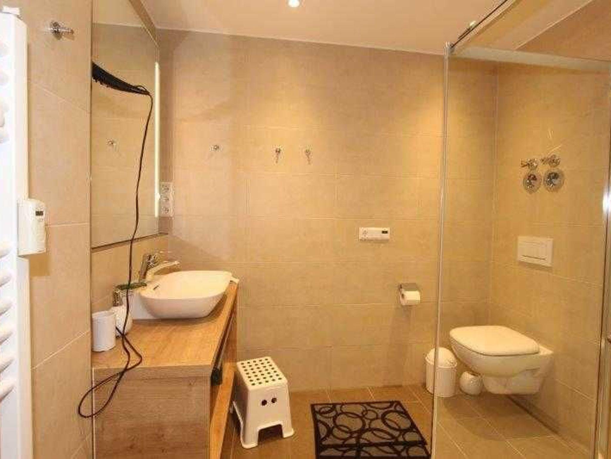Das moderne Bad lädt mit Regendusche inklusive zwei integrierten Infrarotsitzbänken und Bluetooth-Modul zum Musikabspielen zur Entspannung ein. WC, ein Waschbecken mit großem Waschtisch und Ablagefläche und Föhn gibt es natürlich ebenfalls.