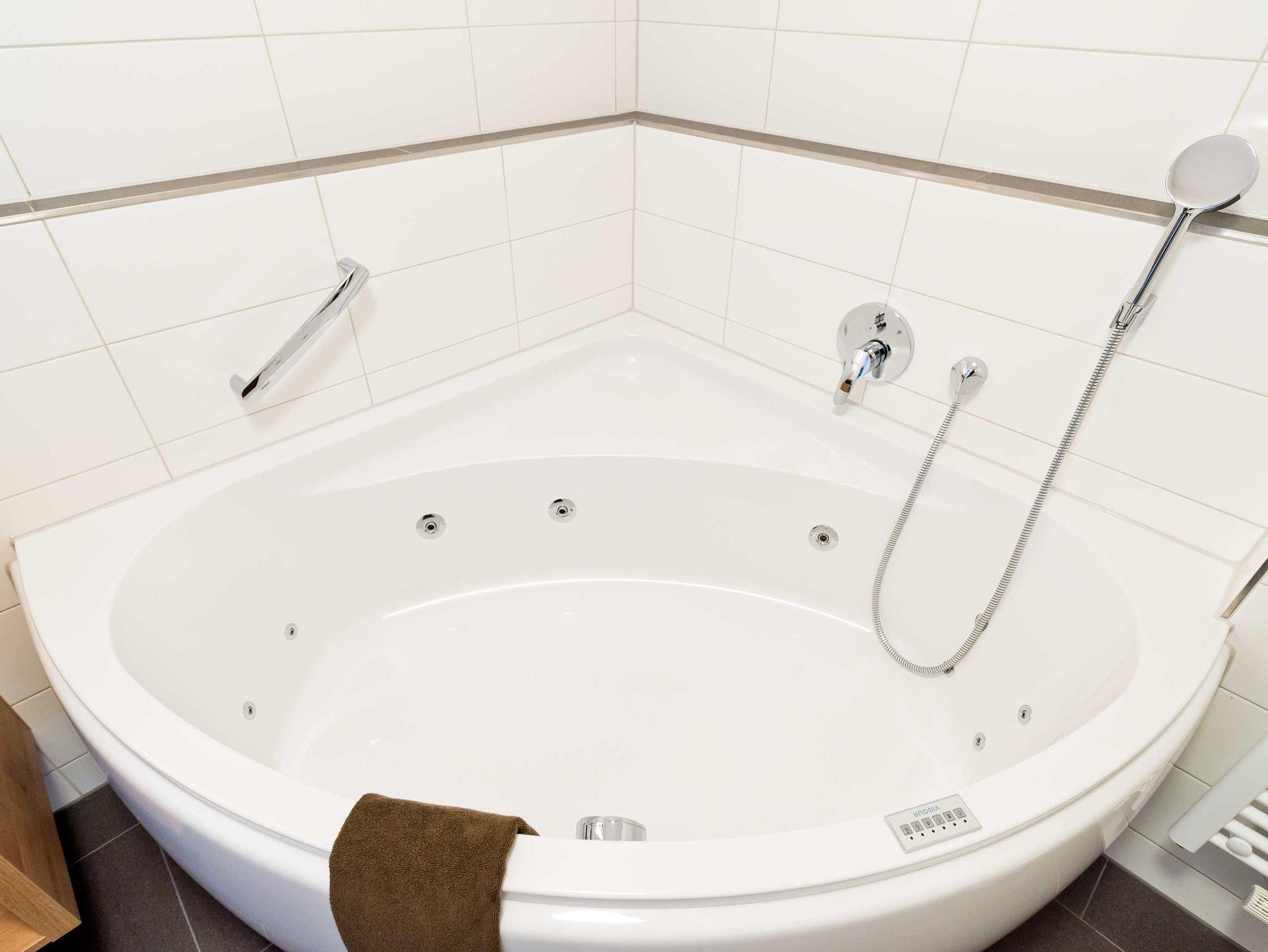 Ergänzt wird der Wohnbereich durch eine Couch, die sich schnell zum Doppelbett umbauen lässt, einen weiteren SAT-TV im Format 55, einen CD-Spieler sowie ein USB- und Bluetooth-Radio. Das Badezimmer mit WC verfügt über eine Dusche und eine Whirlpoolwanne sowie einen Handtuchheizkörper. An kühlen Tagen oder nach einer langen Wanderung können Sie in der wohnungseigenen Sauna entspannen.