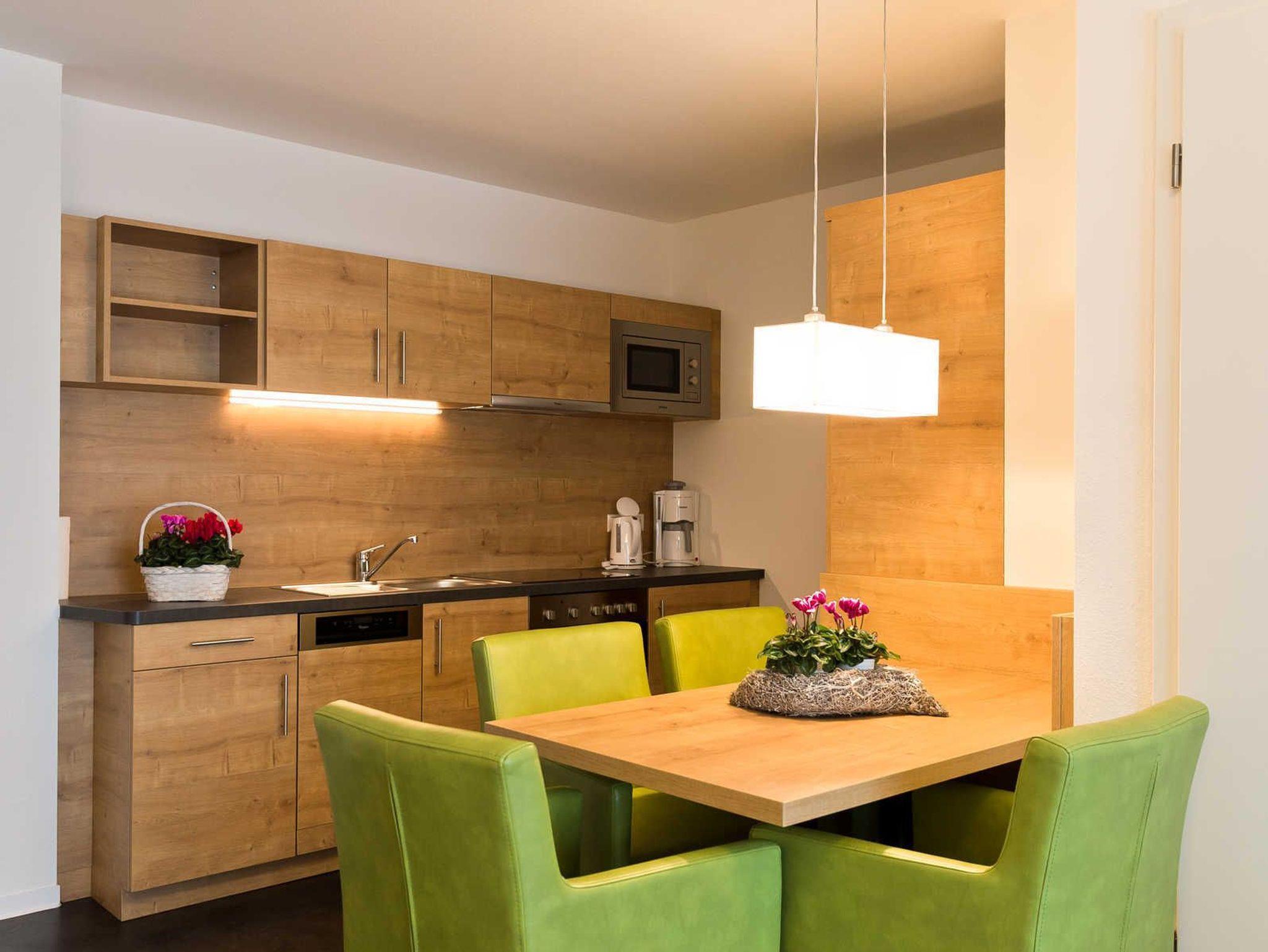 Sie wohnen in einem modernen 3-Zimmer-Appartement für bis zu 6 Personen. Beide Schlafzimmer verfügen über je ein Doppelbett, geräumige Kleiderschränke sowie je einen 43 SAT-TV. Im Wohnbereich mit Zugang zum Balkon finden Sie die voll ausgestattete Küche mit Cerankochfeld, Backofen, Mikrowelle, Kaffeemaschine, Wasserkocher, Toaster und Geschirrspüler. Der Esstisch mit seinen bequemen Sesseln lädt zum gemütlichen Beisammensein ein.